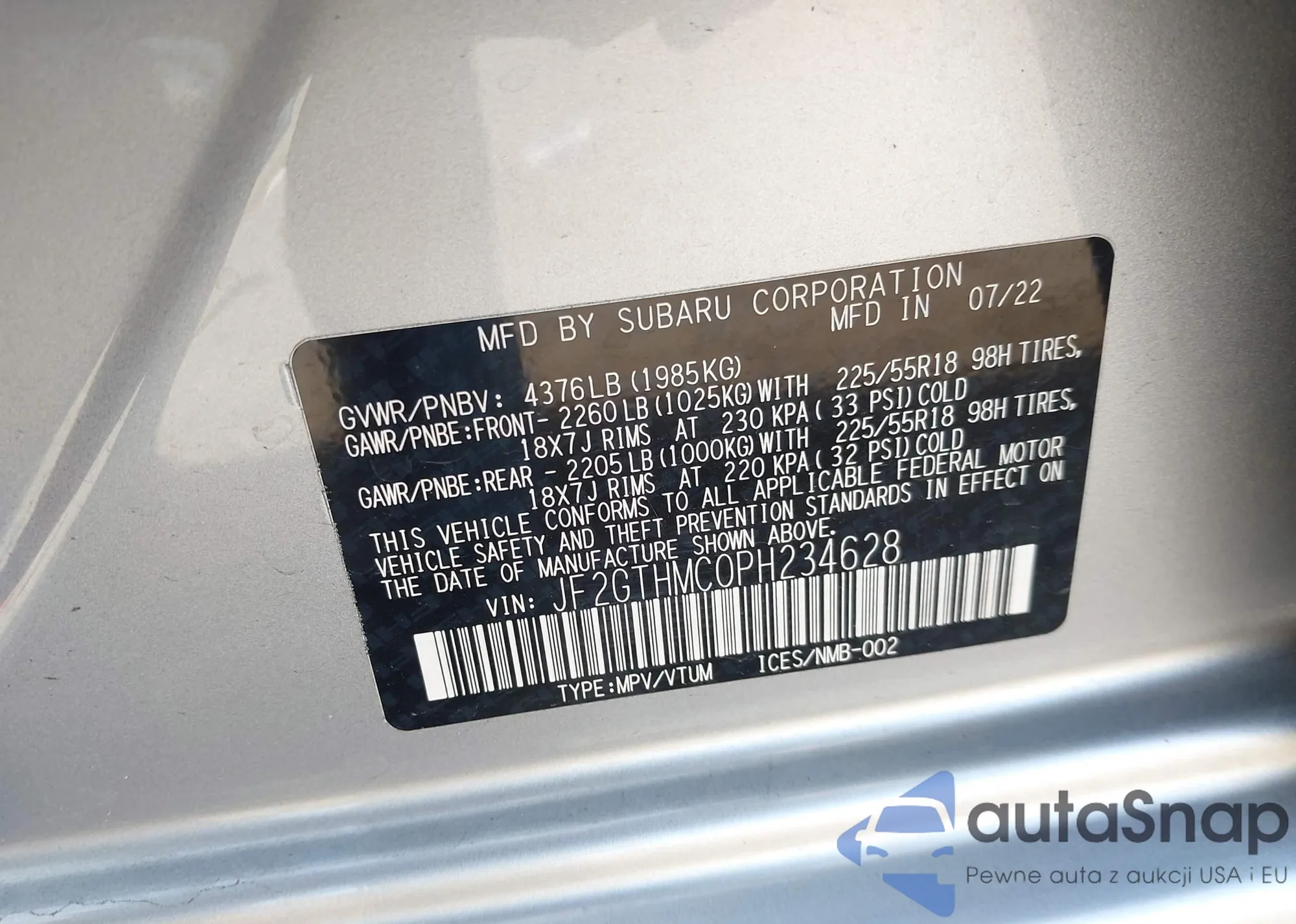 The car Subaru XV 2023 (VIN JF2GTHMC0PH234628) has not been auctioned before. The documents are clean, and the mileage matches or is below the market average. Sold by an insurance company – we recommend purchase. Delivery to the port will take approx. 6–8 weeks.