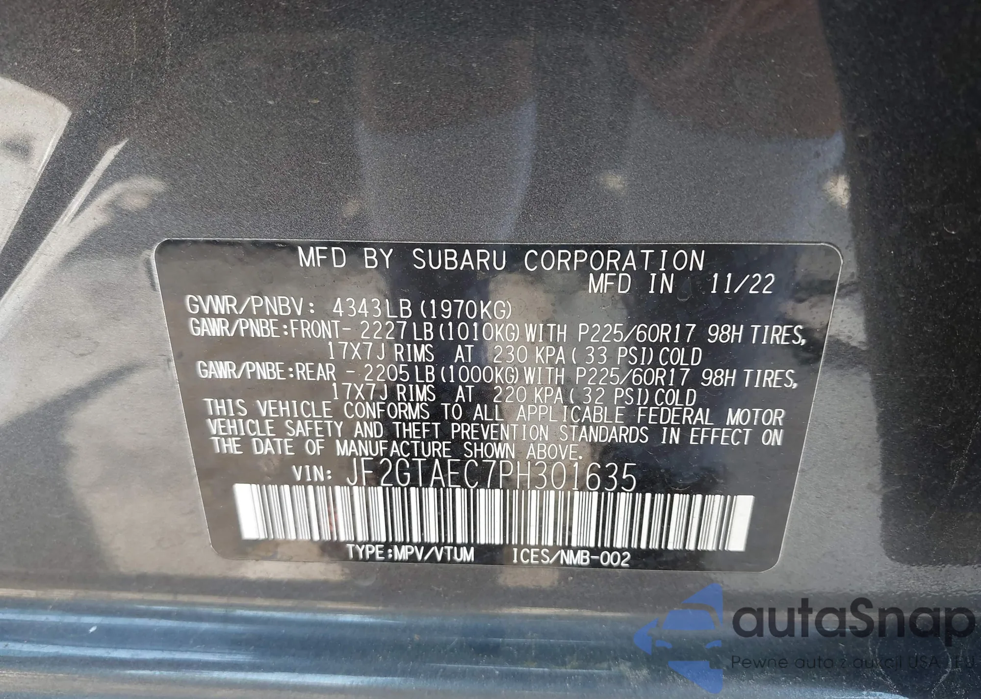 • VIN: JF2GTAEC7PH301635