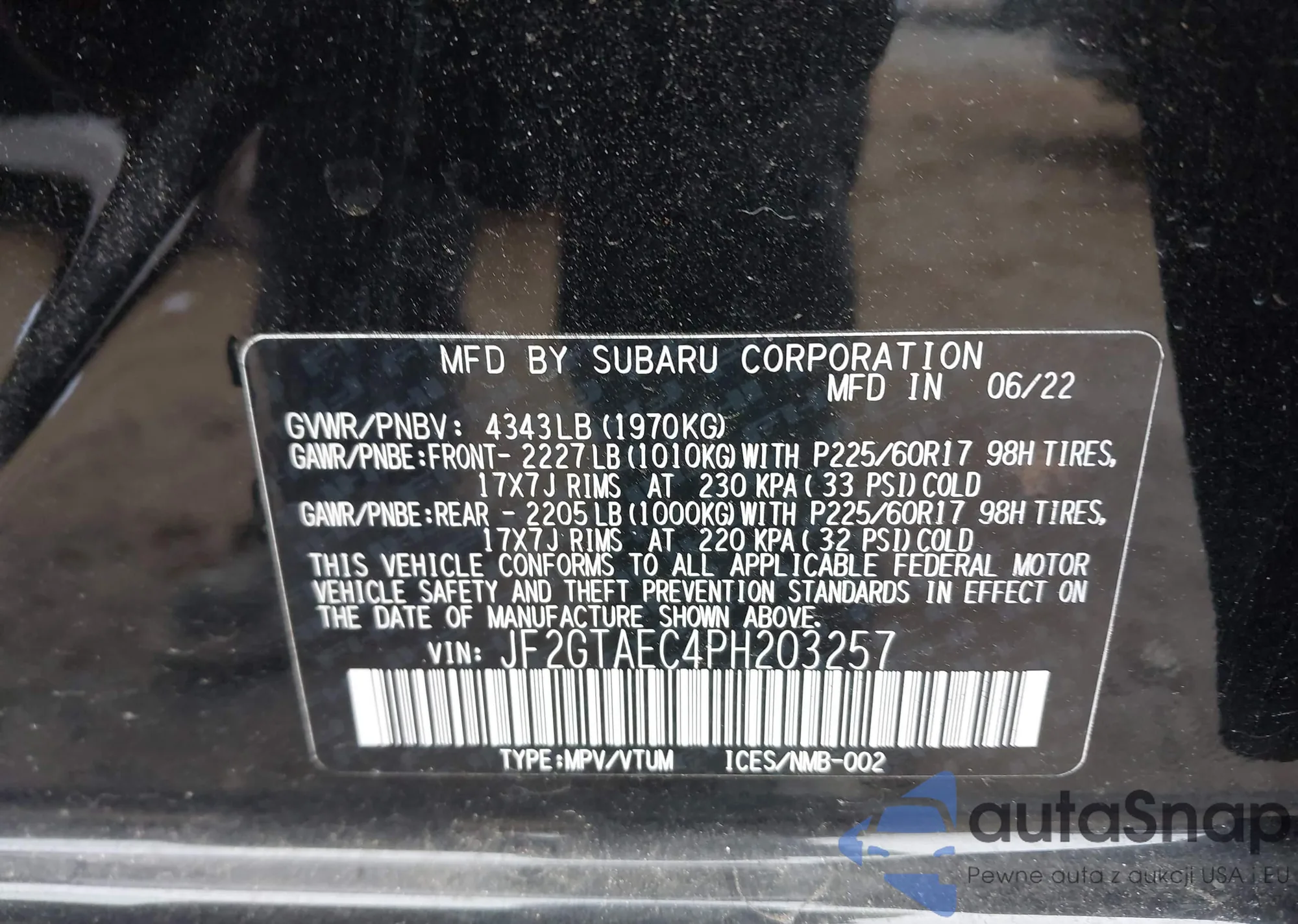 The car Subaru XV 2023 (VIN JF2GTAEC4PH203257) has not been auctioned before. The documents are clean, and the mileage matches or is below the market average. Sold by an insurance company – we recommend purchase. Delivery to the port will take approx. 6–8 weeks.