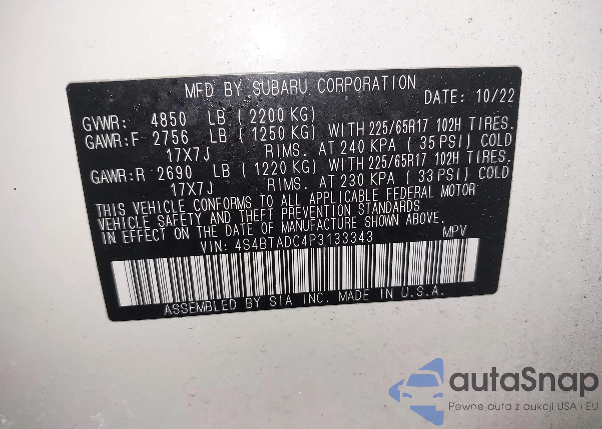 The car Subaru Outback 2023 (VIN 4S4BTADC4P3133343) has not been auctioned before. The documents are clean, and the mileage matches or is below the market average. Sold by an insurance company – we recommend purchase. Delivery to the port will take approx. 6–8 weeks.