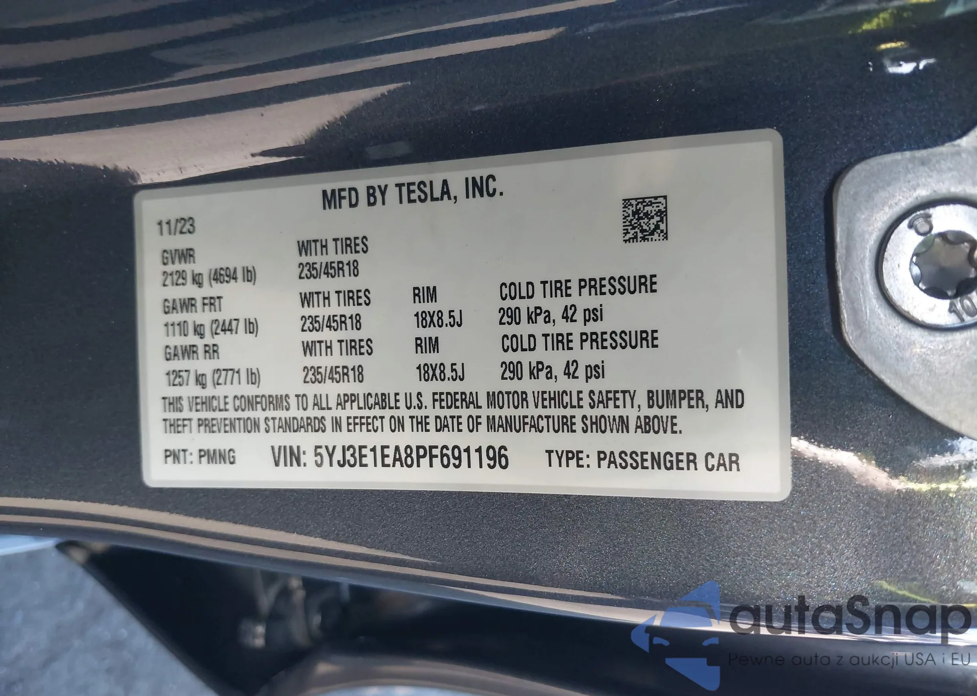 • VIN: 5YJ3E1EA8PF691196