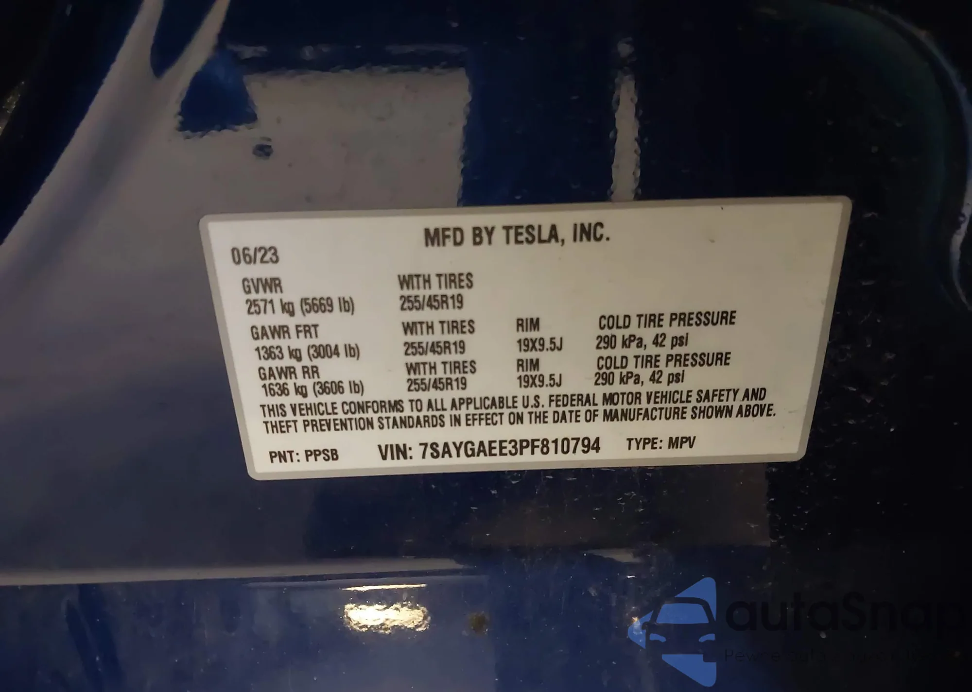 The car Tesla Model Y 2023 (VIN 7SAYGAEE3PF810794) has documents that prevent registration. Export and registration may be difficult. Contact AutaSnap experts to find alternatives.