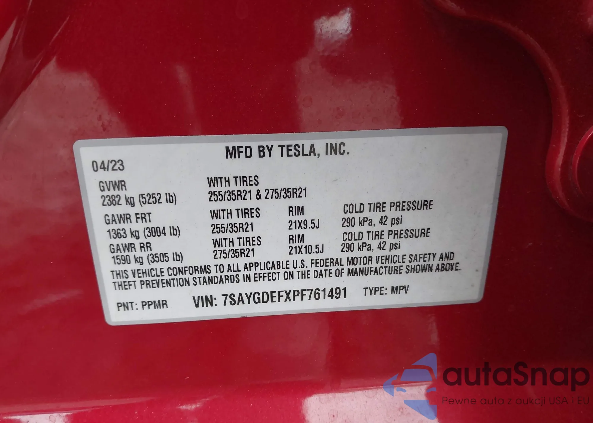 The car Tesla Model Y 2023 (VIN 7SAYGDEFXPF761491) has not been auctioned before. The documents are clean, and the mileage matches or is below the market average. Sold by an insurance company – we recommend purchase. Delivery to the port will take approx. 6–8 weeks.