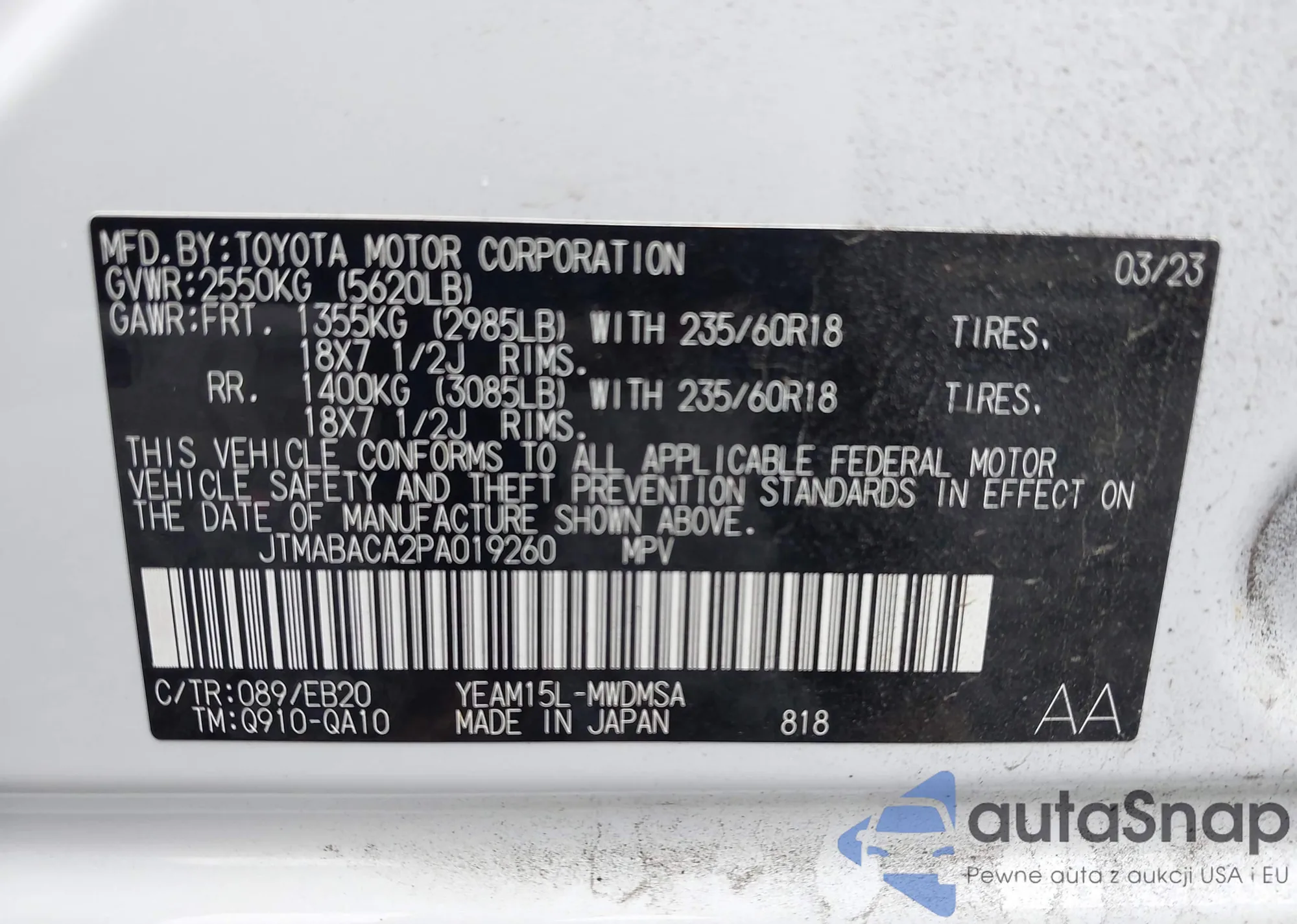 The car Toyota bZ4X 2023 (VIN JTMABACA2PA019260) has not been auctioned before. The documents are clean, and the mileage matches or is below the market average. Sold by an insurance company – we recommend purchase. Delivery to the port will take approx. 6–8 weeks.