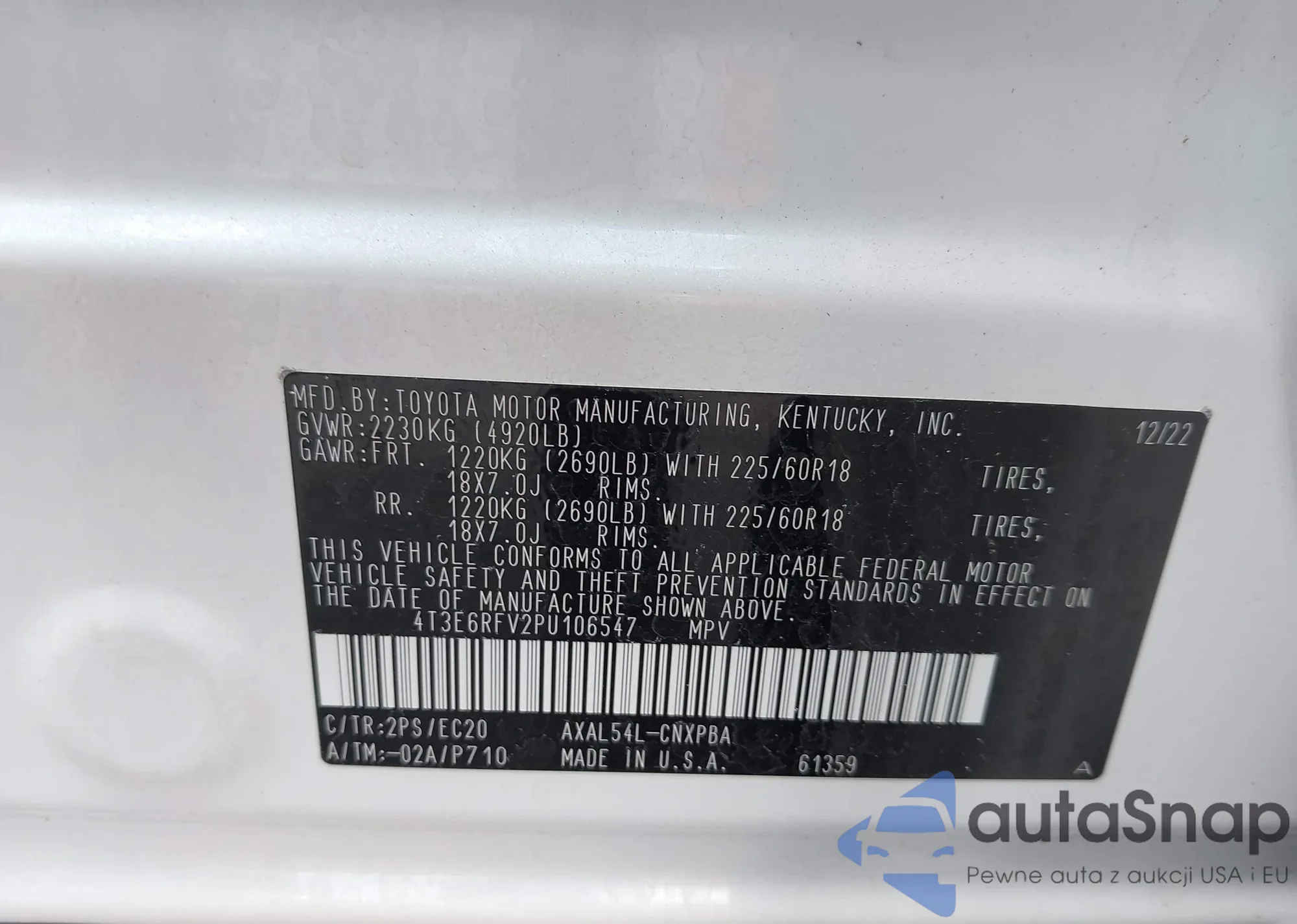 VIN: 4T3E6RFV2PU106547