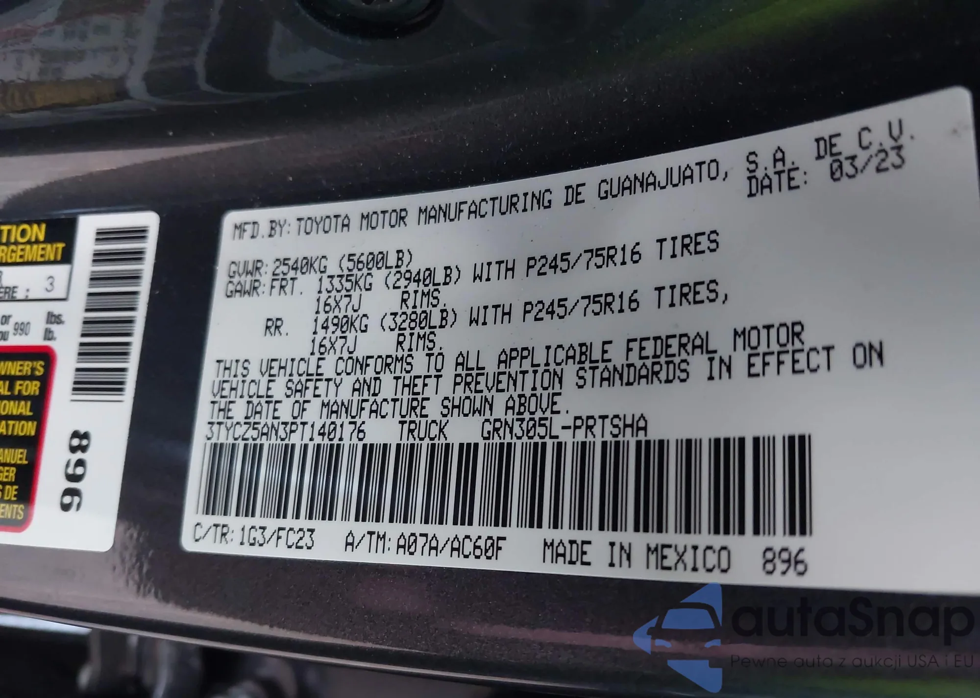VIN: 3TYCZ5AN3PT140176