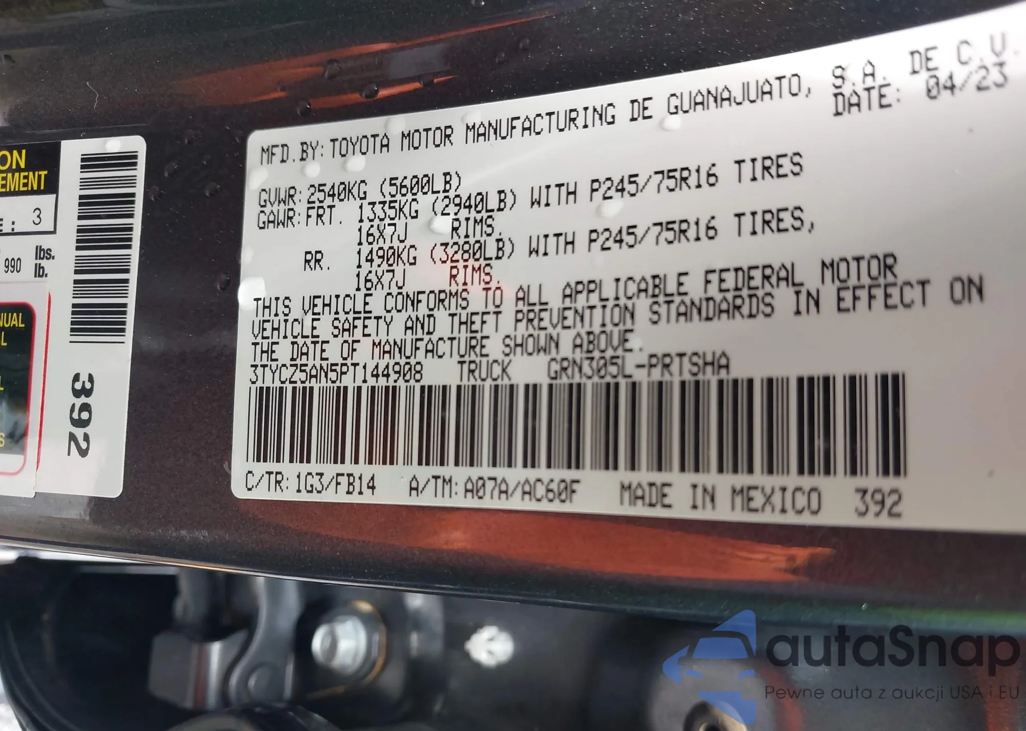 VIN: 3TYCZ5AN5PT144908