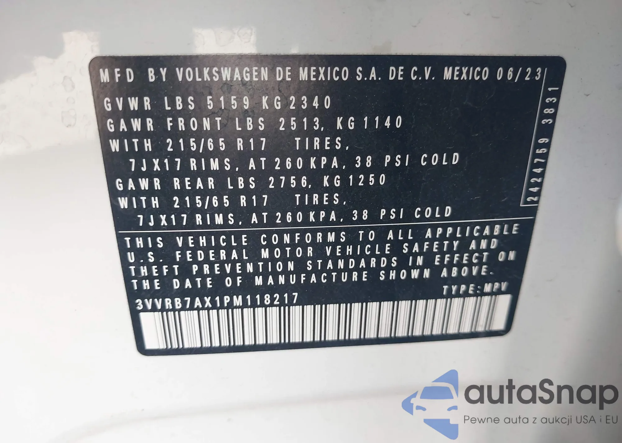 VIN: 3VVRB7AX1PM118217
