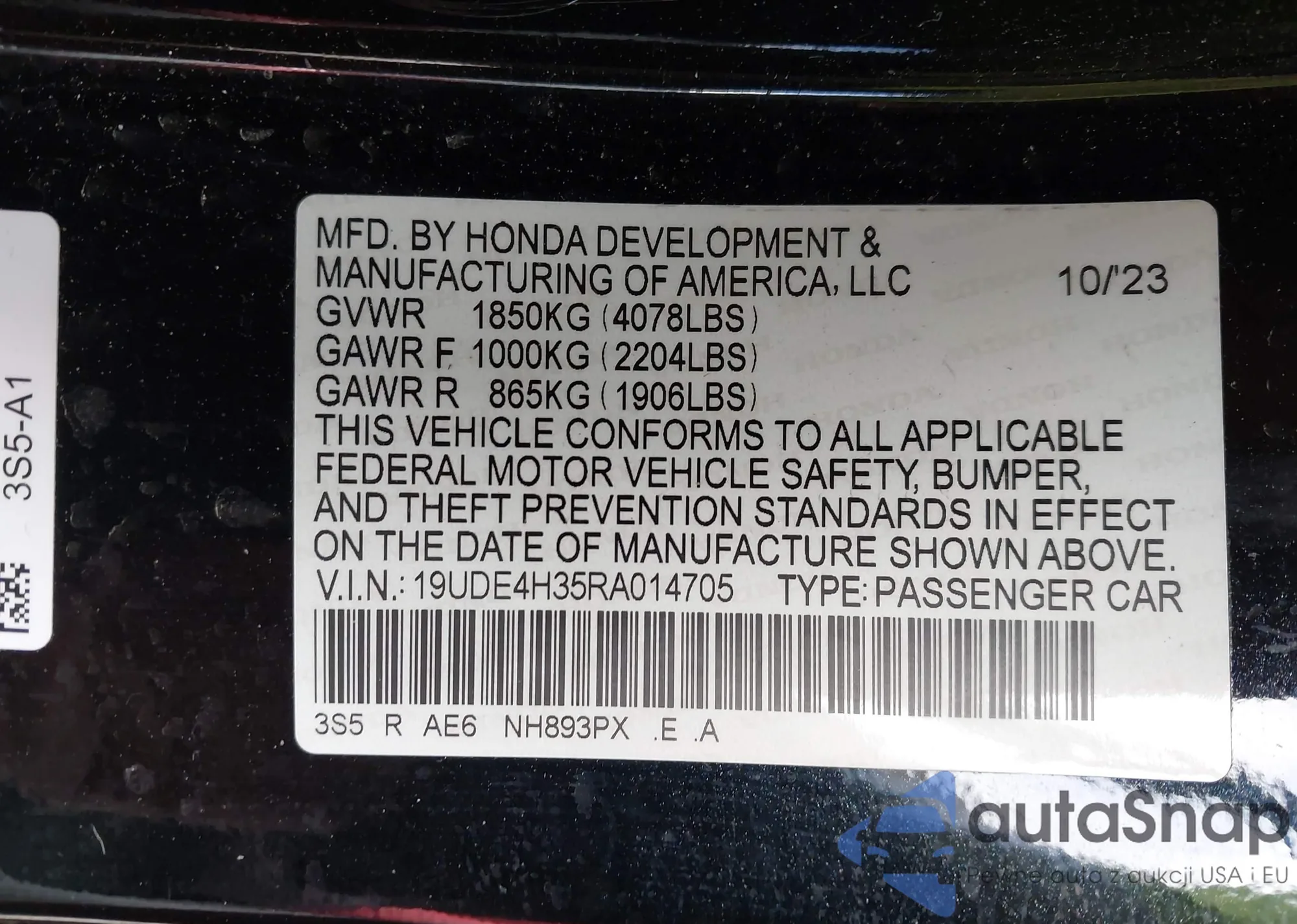 • VIN: 19UDE4H35RA014705