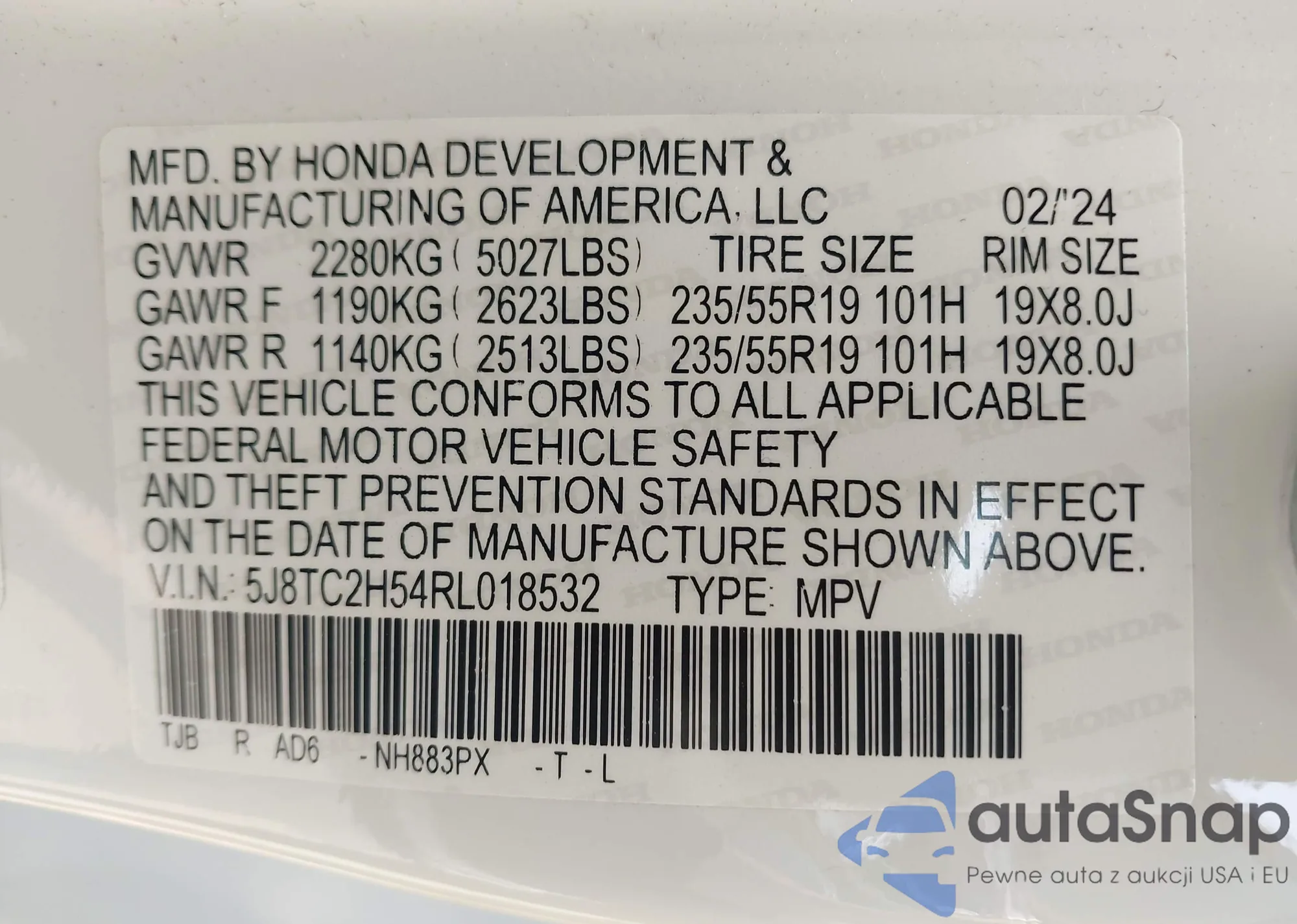 VIN: 5J8TC2H54RL018532