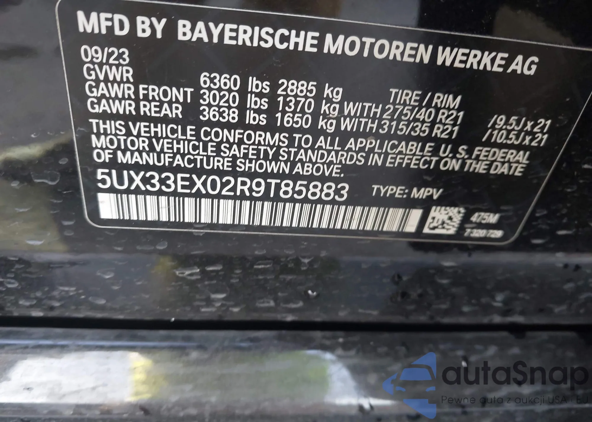 • VIN: 5UX33EX02R9T85883
