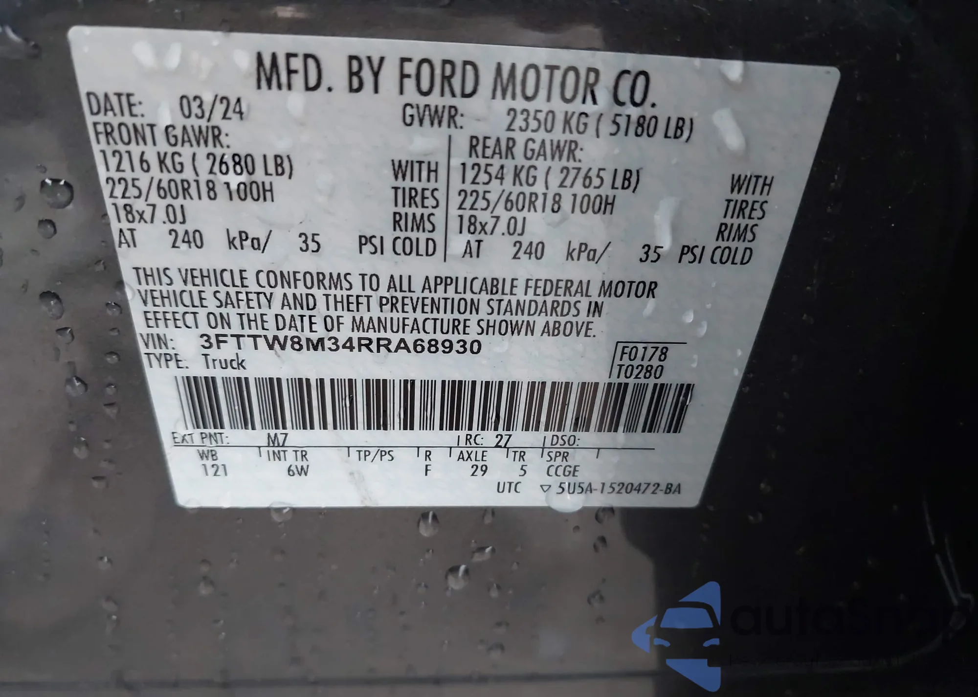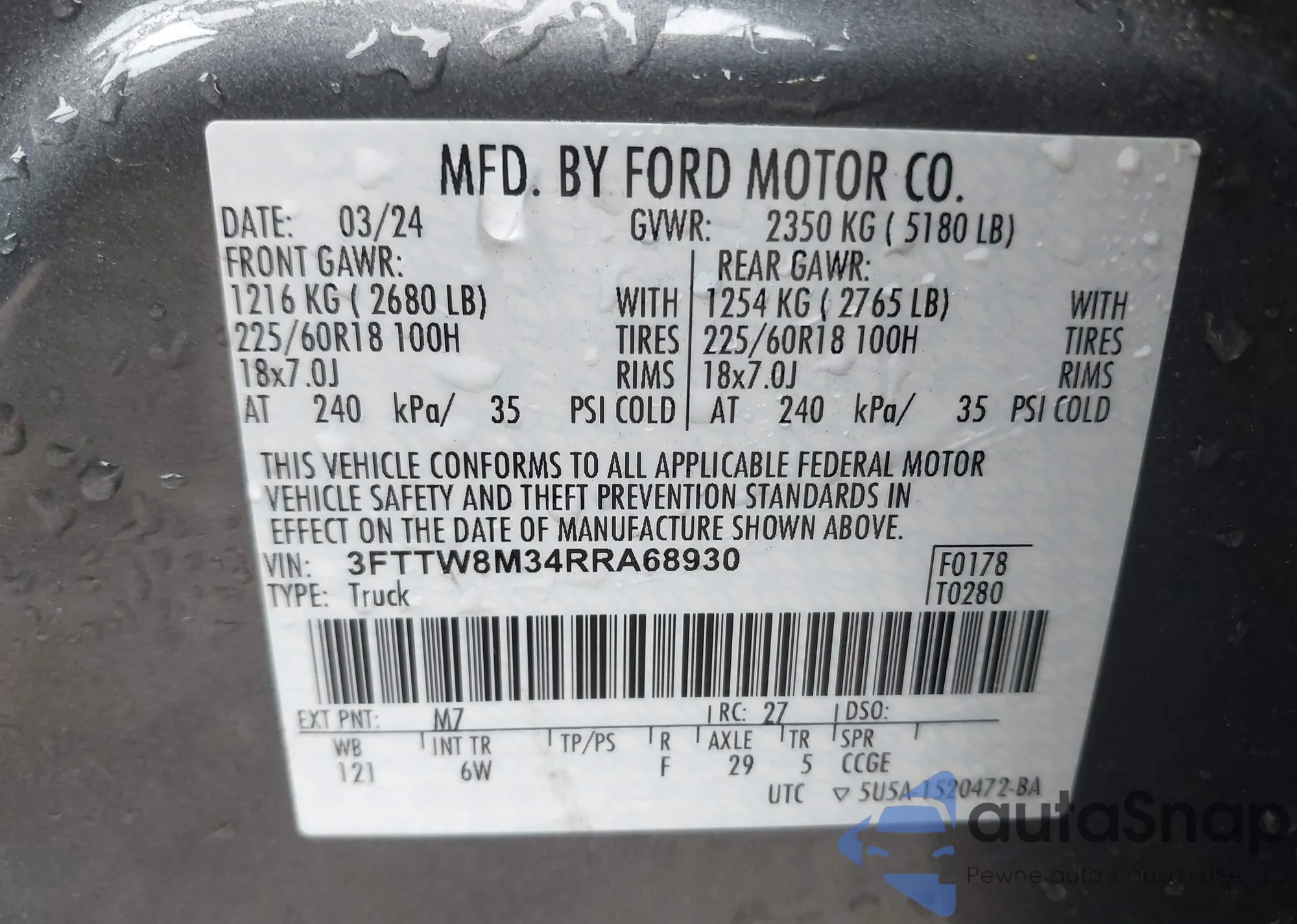 The car Ford Maverick 2024 (VIN 3FTTW8M34RRA68930) has not been auctioned before. The documents are clean, and the mileage matches or is below the market average. Sold by an insurance company – we recommend purchase. Delivery to the port will take approx. 6–8 weeks.