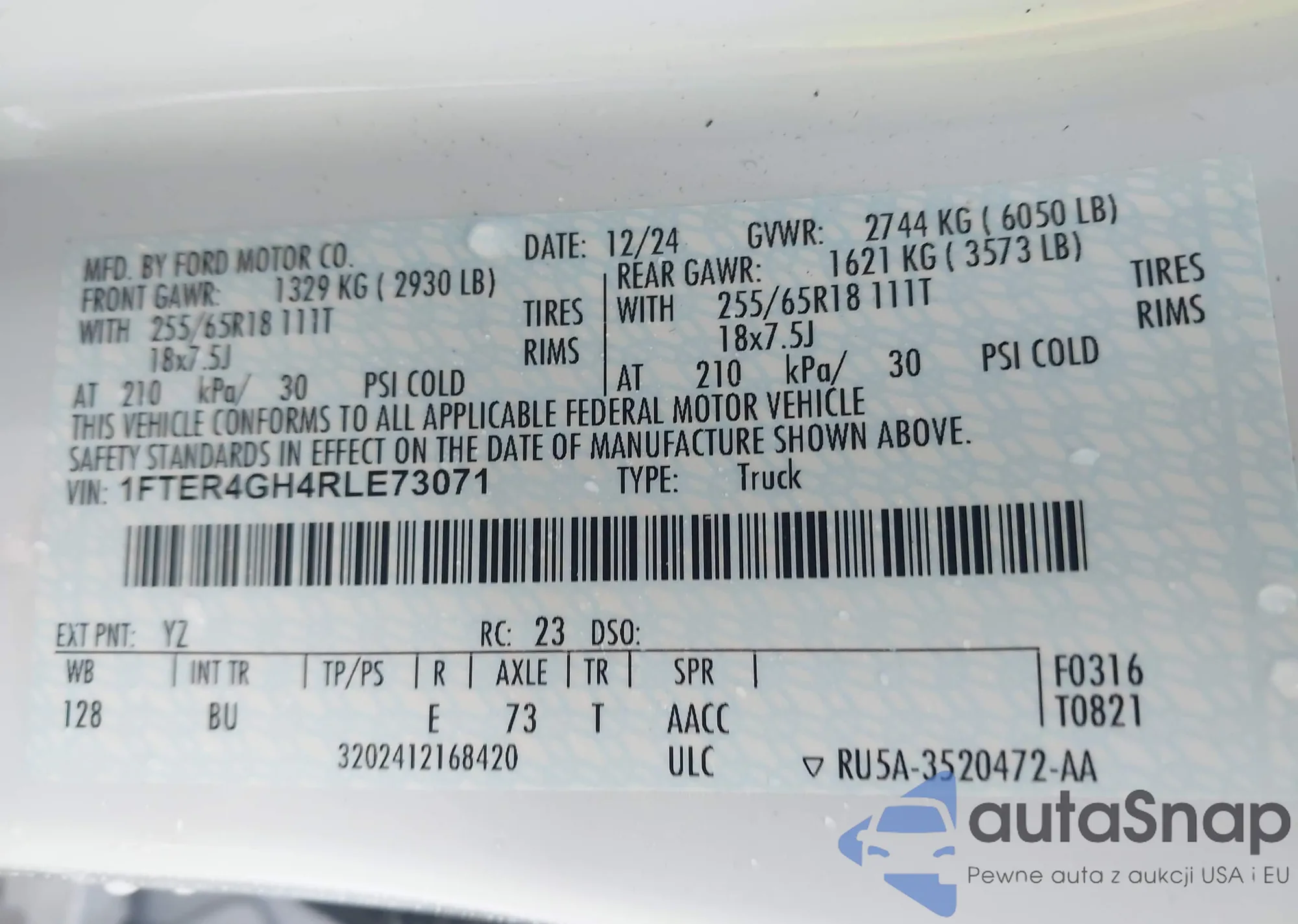 The car Ford Ranger 2024 (VIN 1FTER4GH4RLE73071) has not been auctioned before. The documents are clean, and the mileage matches or is below the market average. Sold by an insurance company – we recommend purchase. Delivery to the port will take approx. 6–8 weeks.