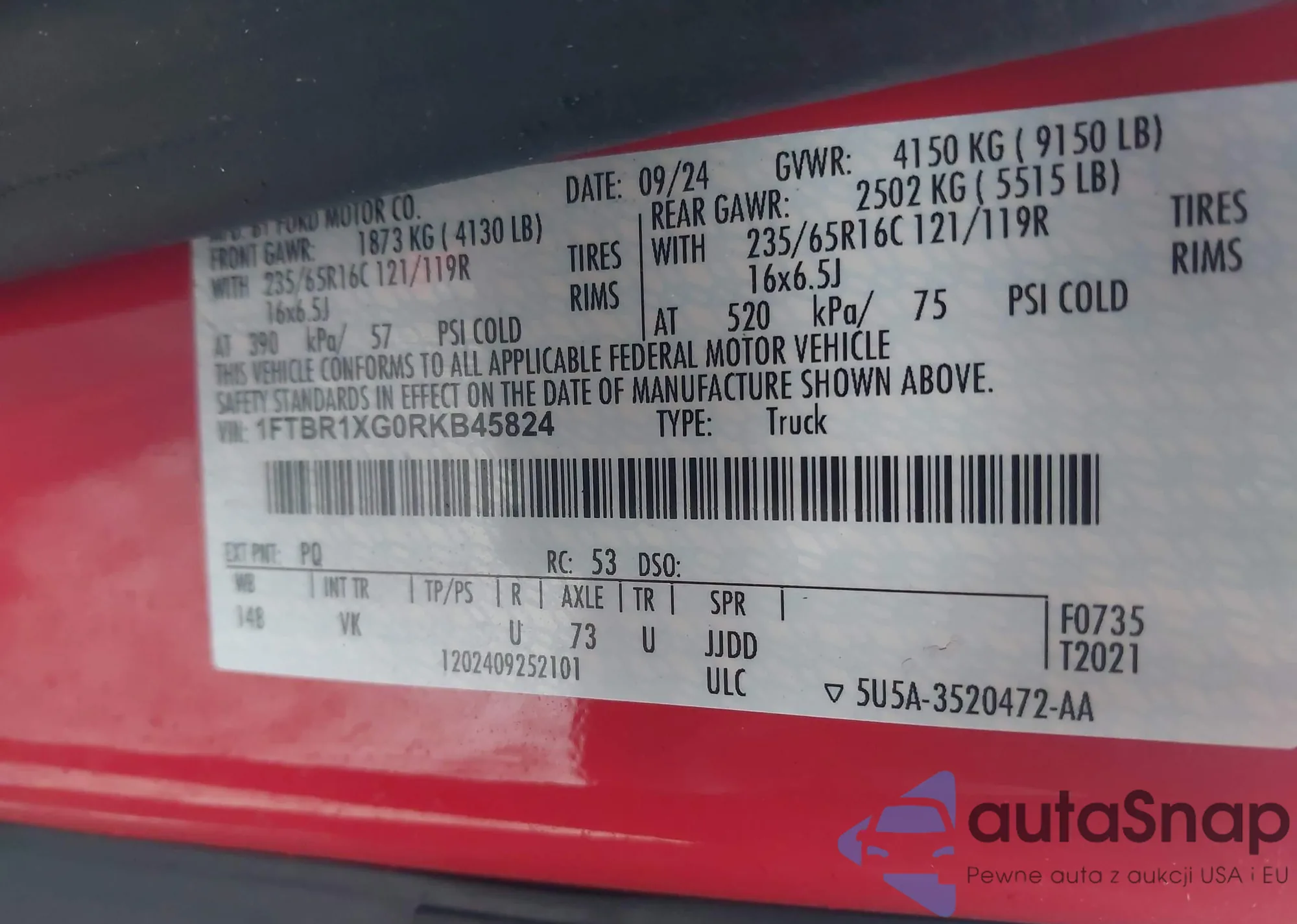 The car Ford Transit 2024 (VIN 1FTBR1XG0RKB45824) has not been auctioned before. The documents are clean, and the mileage matches or is below the market average. Sold by an insurance company – we recommend purchase. Delivery to the port will take approx. 6–8 weeks.