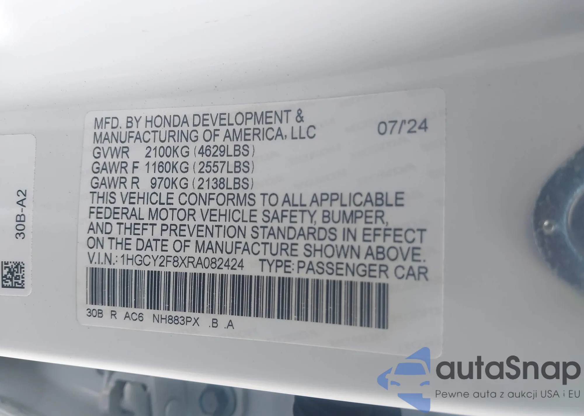 The car Honda Accord 2024 (VIN 1HGCY2F8XRA082424) has documents that prevent registration. Export and registration may be difficult. Contact AutaSnap experts to find alternatives.