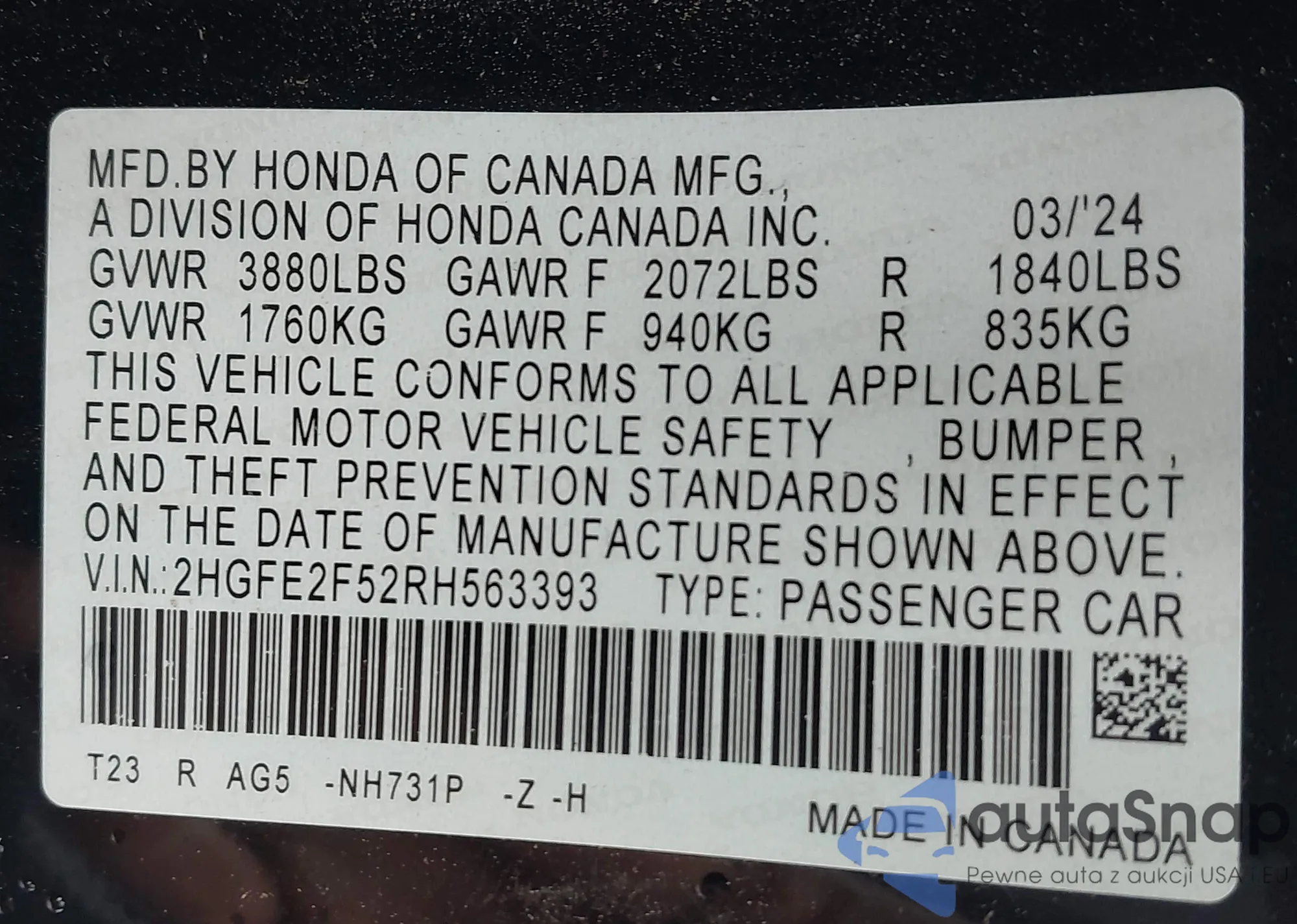 VIN: 2HGFE2F52RH563393