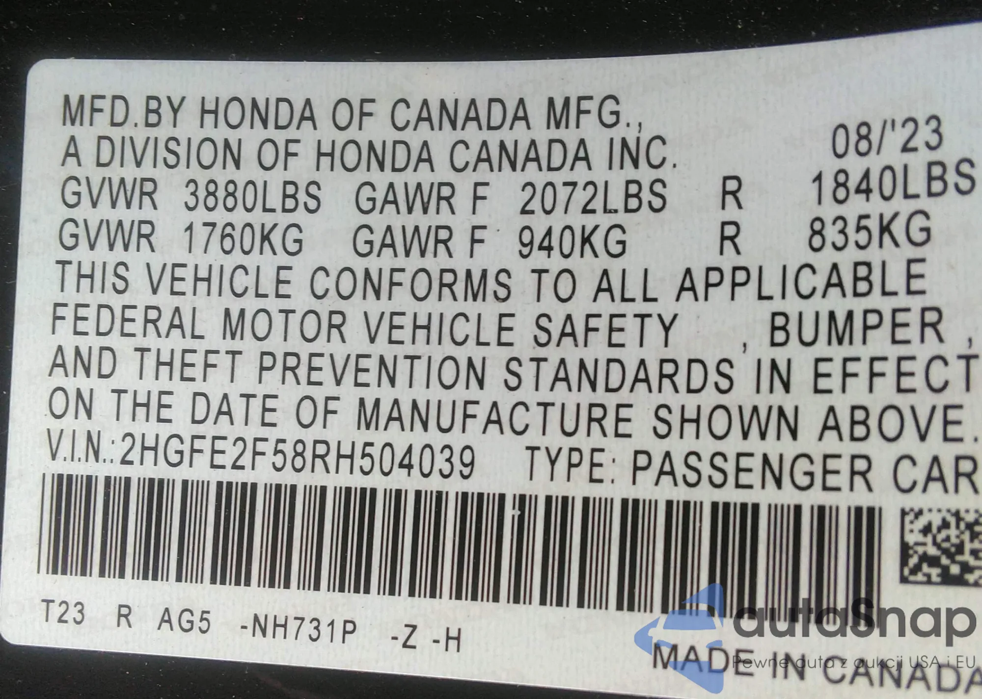 VIN: 2HGFE2F58RH504039