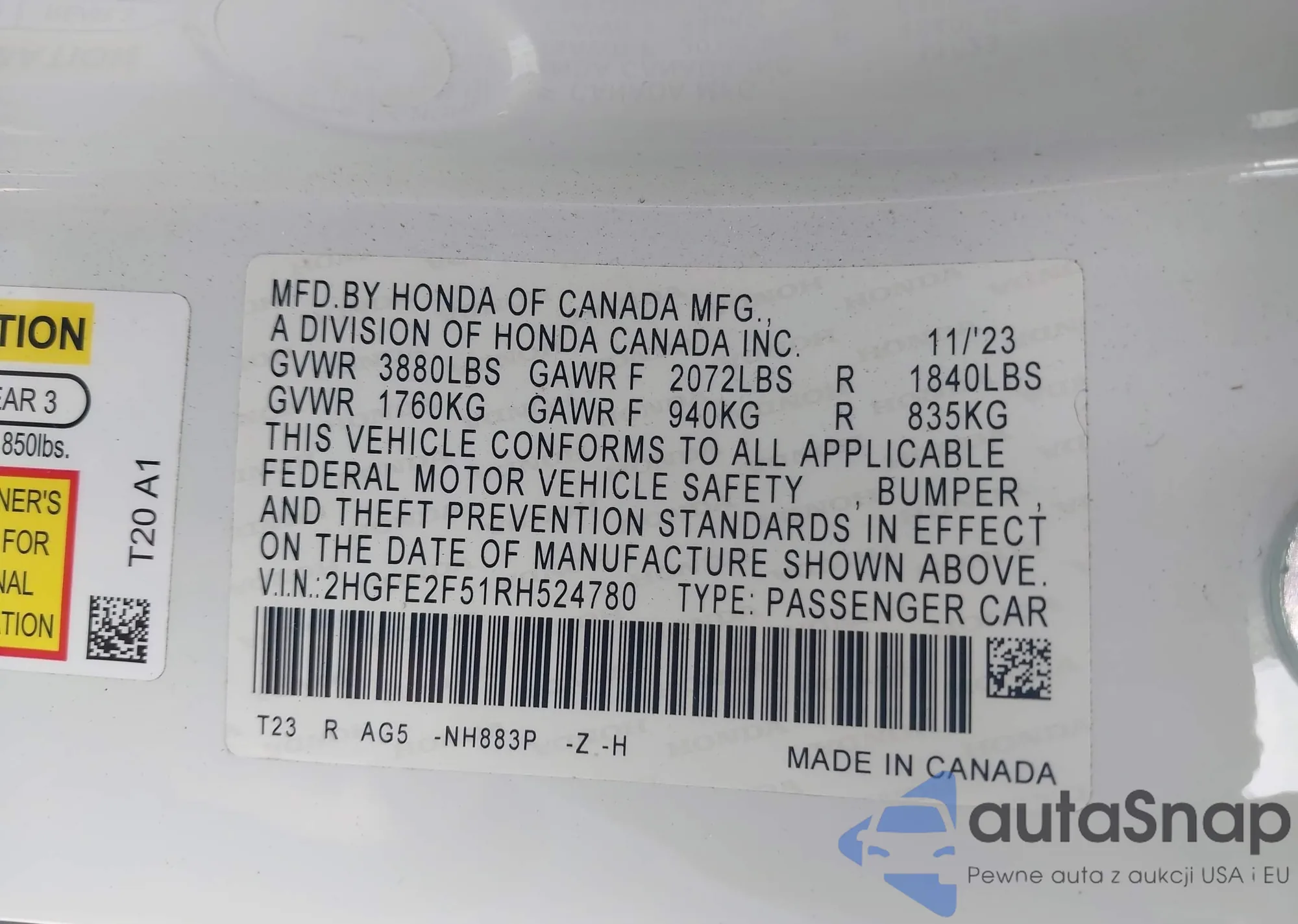 The car Honda Civic 2024 (VIN 2HGFE2F51RH524780) has documents that prevent registration. Export and registration may be difficult. Contact AutaSnap experts to find alternatives.