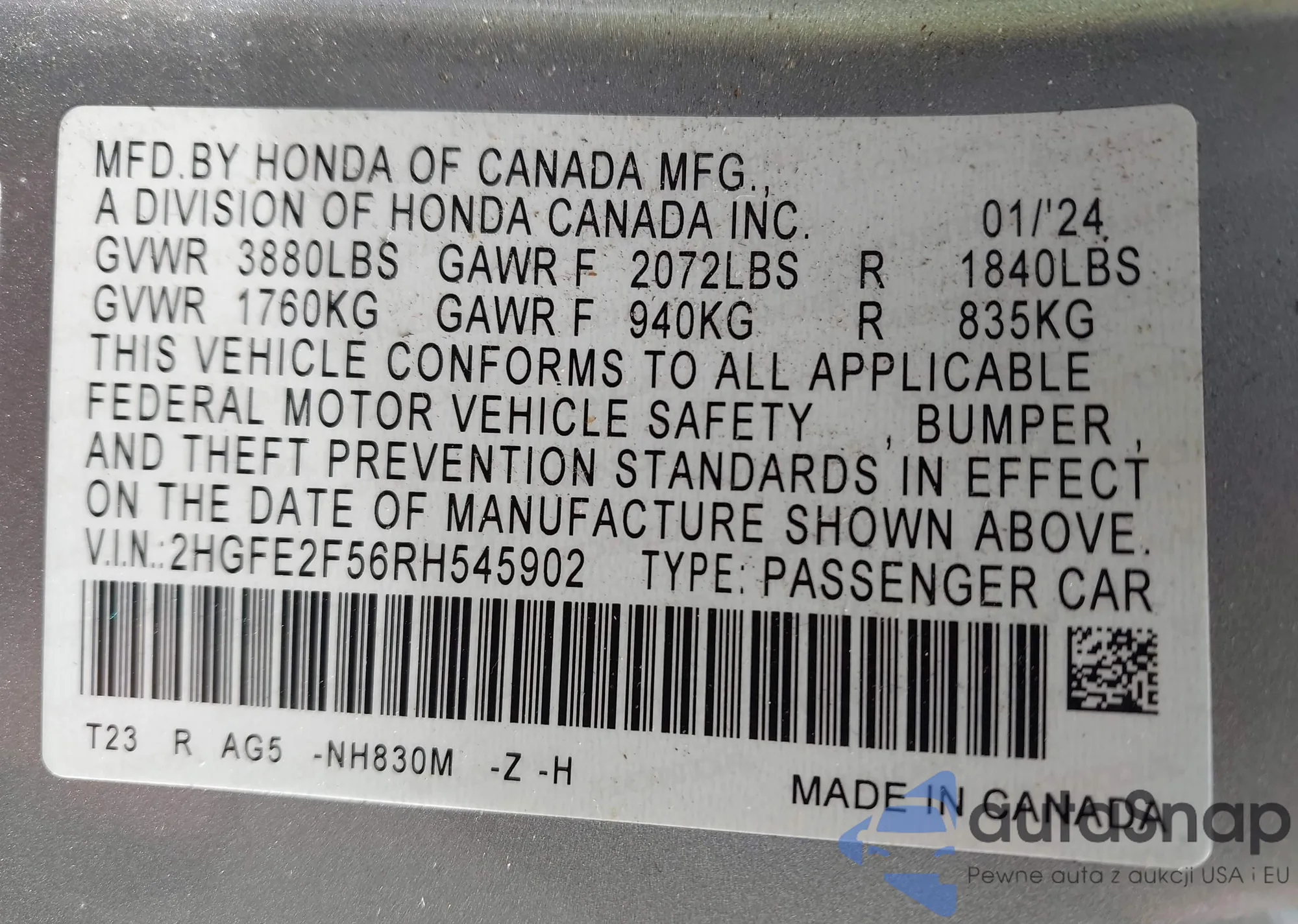 • VIN: 2HGFE2F56RH545902