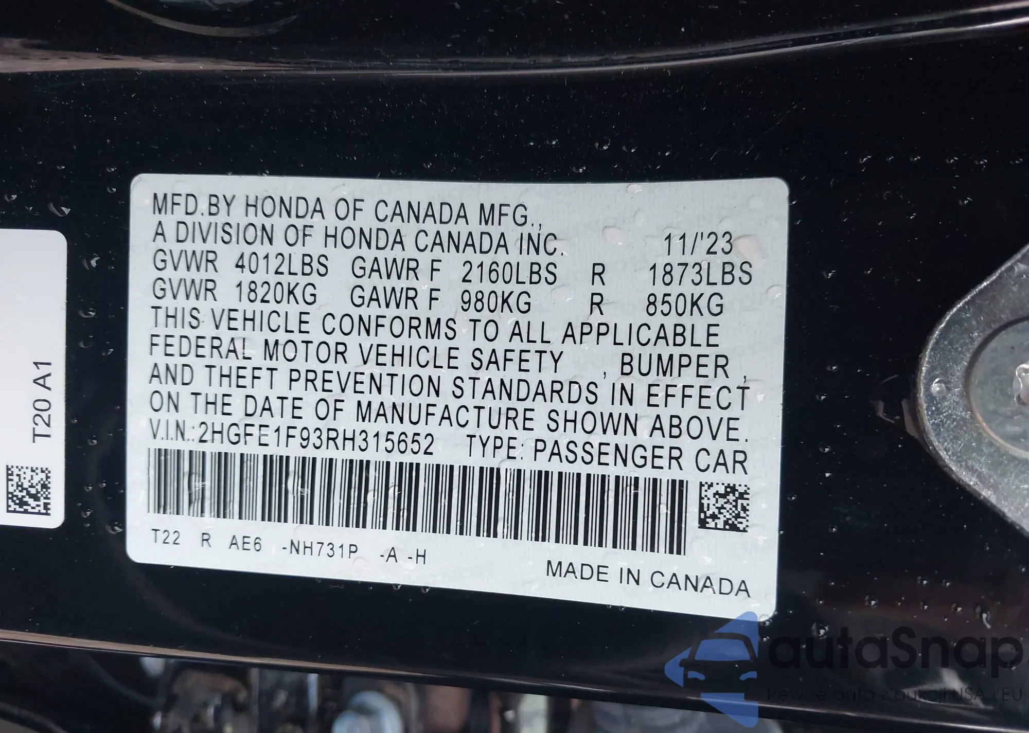 • VIN: 2HGFE1F93RH315652
