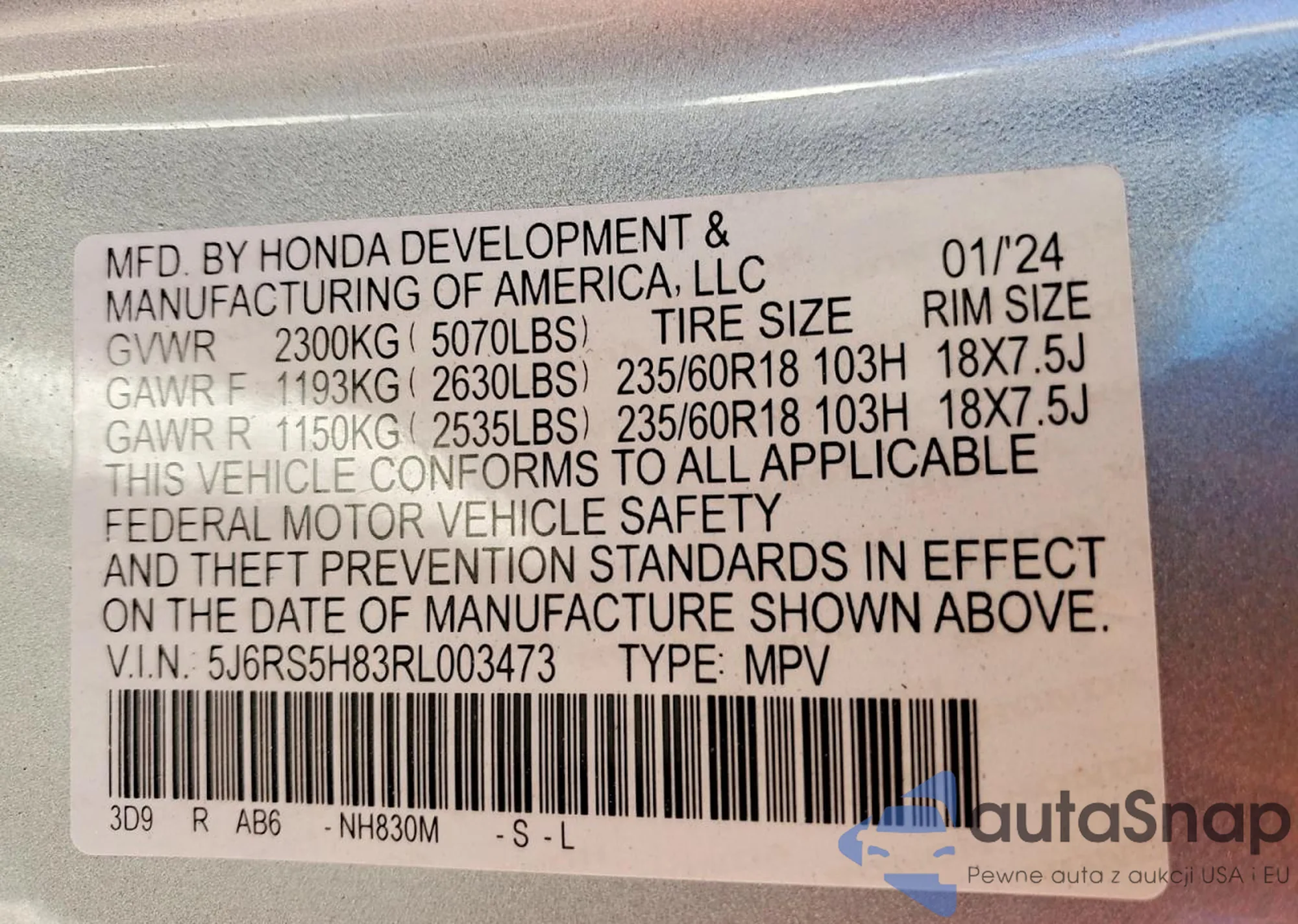 VIN: 5J6RS5H83RL003473
