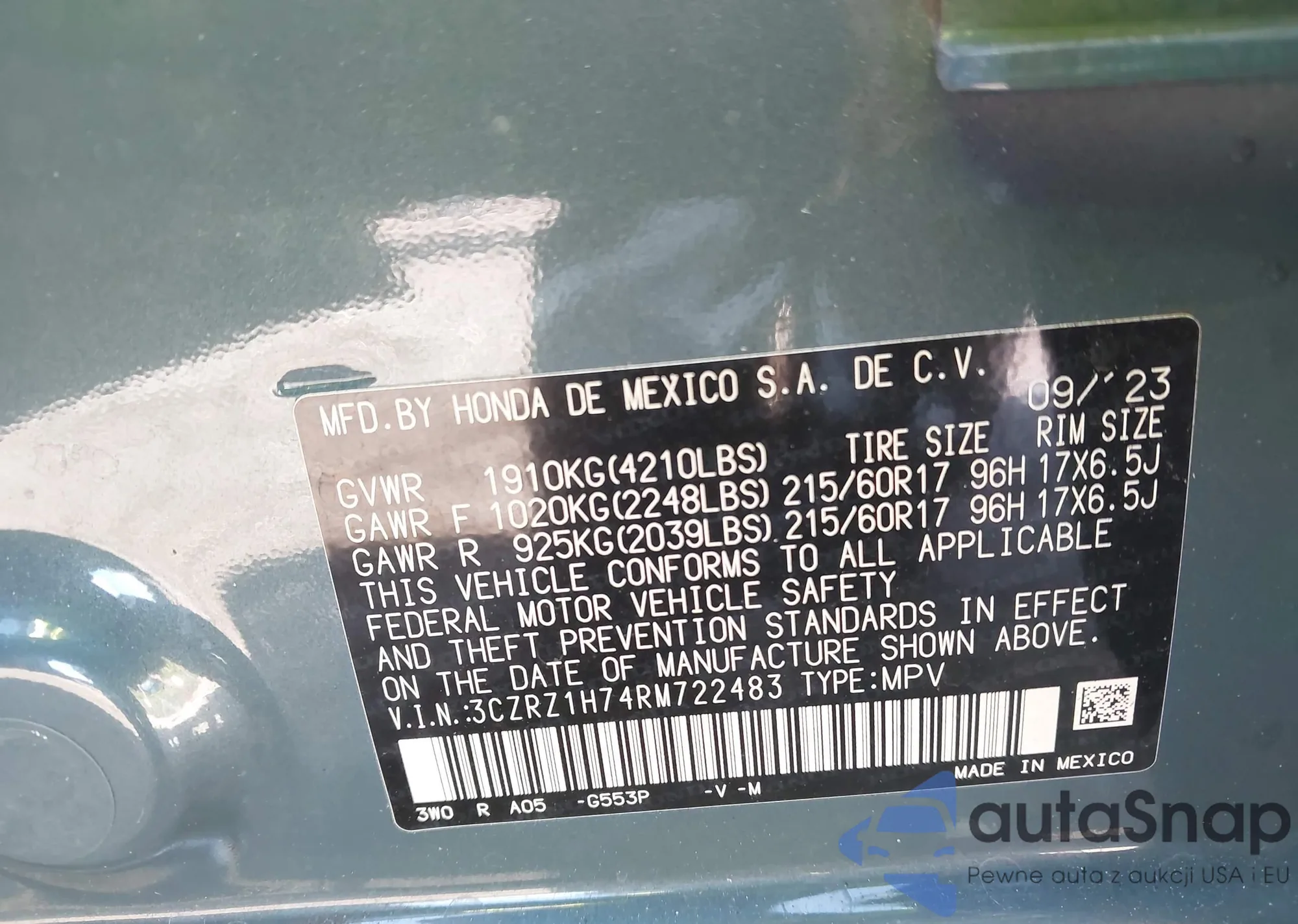 The car Honda HR-V 2024 (VIN 3CZRZ1H74RM722483) has documents that prevent registration. Export and registration may be difficult. Contact AutaSnap experts to find alternatives.