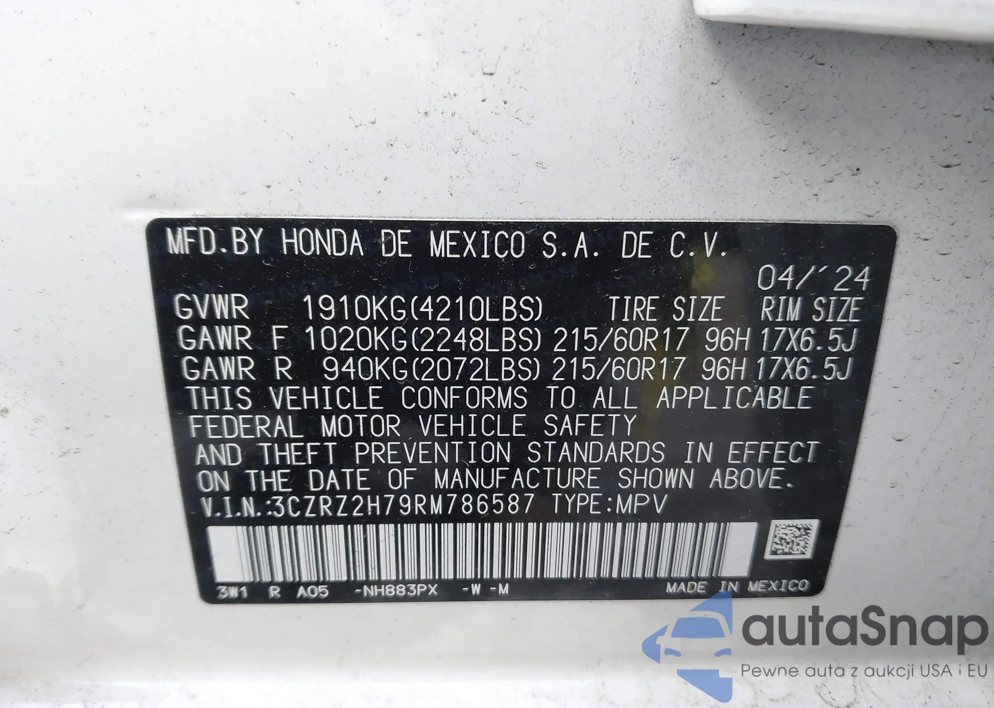 The car Honda HR-V 2024 (VIN 3CZRZ2H79RM786587) has not been auctioned before. The documents are clean, and the mileage matches or is below the market average. Sold by an insurance company – we recommend purchase. Delivery to the port will take approx. 6–8 weeks.