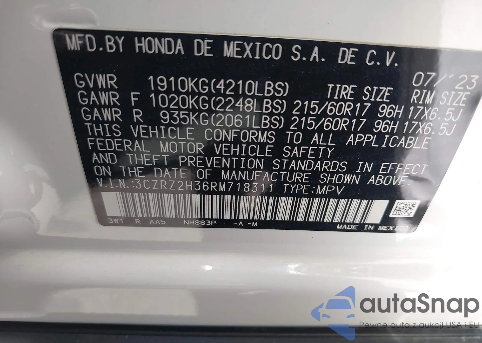 Honda HR-V 2024 – Vehicle History (Sold at IAAI)