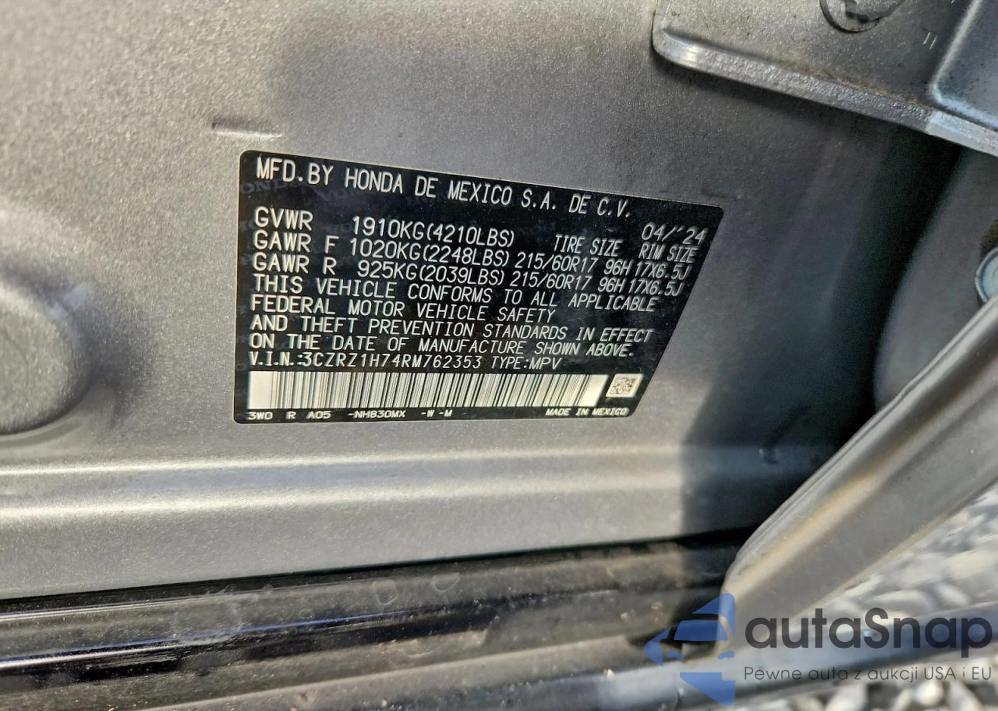 The car Honda HR-V 2024 (VIN 3CZRZ1H74RM762353) is sold by an unverified seller. We recommend checking the Carfax report and confirming registration possibilities before purchase.