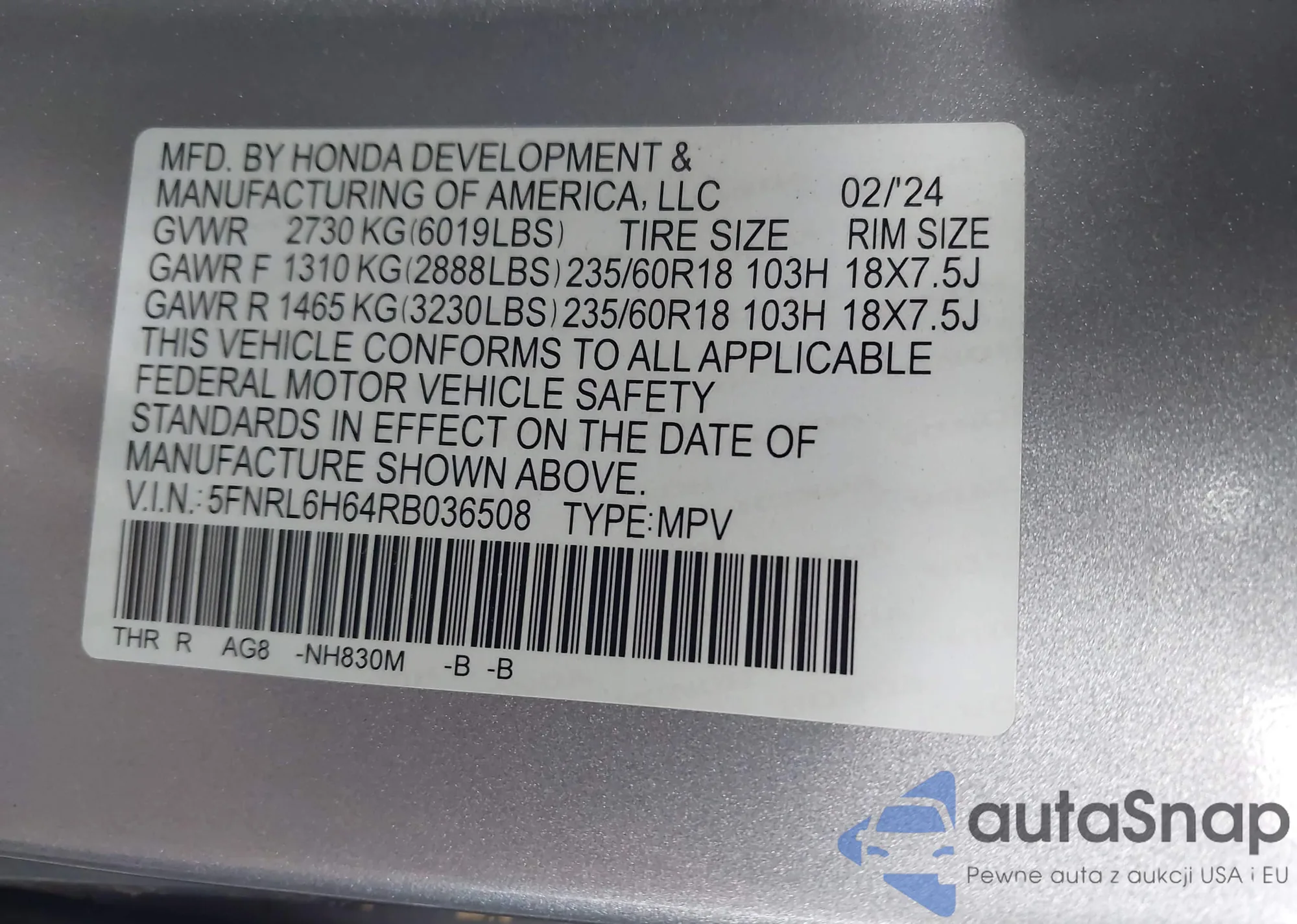 VIN: 5FNRL6H64RB036508