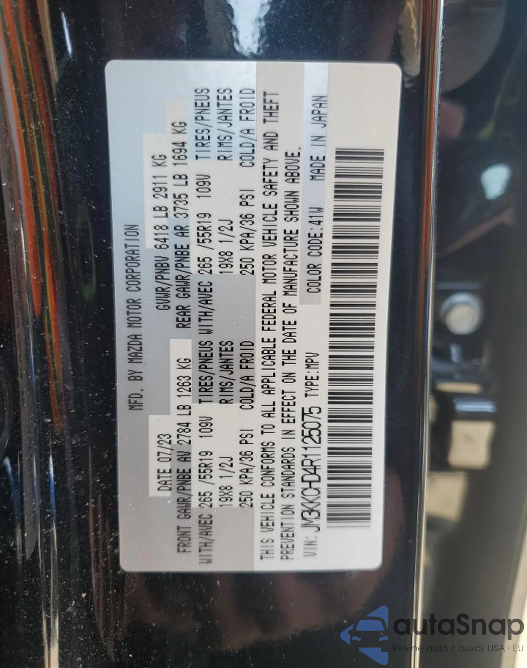 The car Mazda CX-90 2024 (VIN JM3KKCHD4R1125075) has documents that prevent registration. Export and registration may be difficult. Contact AutaSnap experts to find alternatives.
