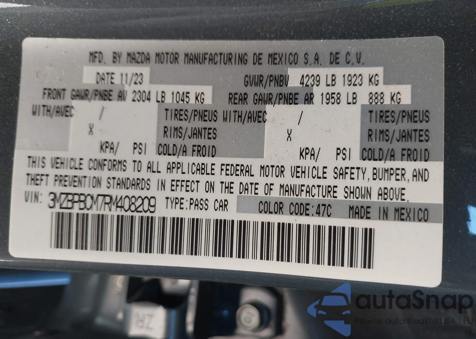 The car Mazda 3 2024 (VIN 3MZBPBCM7RM408209) has not been auctioned before. The documents are clean, and the mileage matches or is below the market average. Sold by an insurance company – we recommend purchase. Delivery to the port will take approx. 6–8 weeks.
