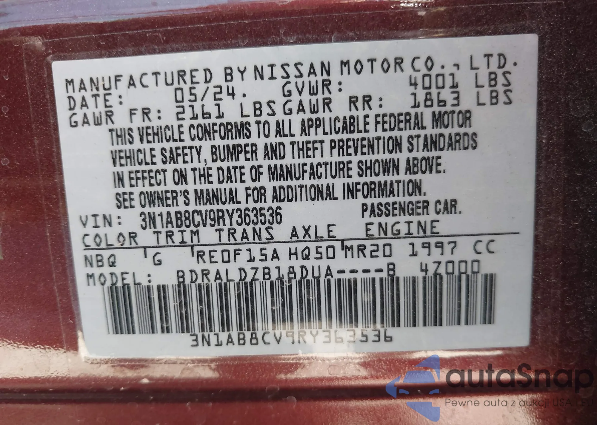 VIN: 3N1AB8CV9RY363536