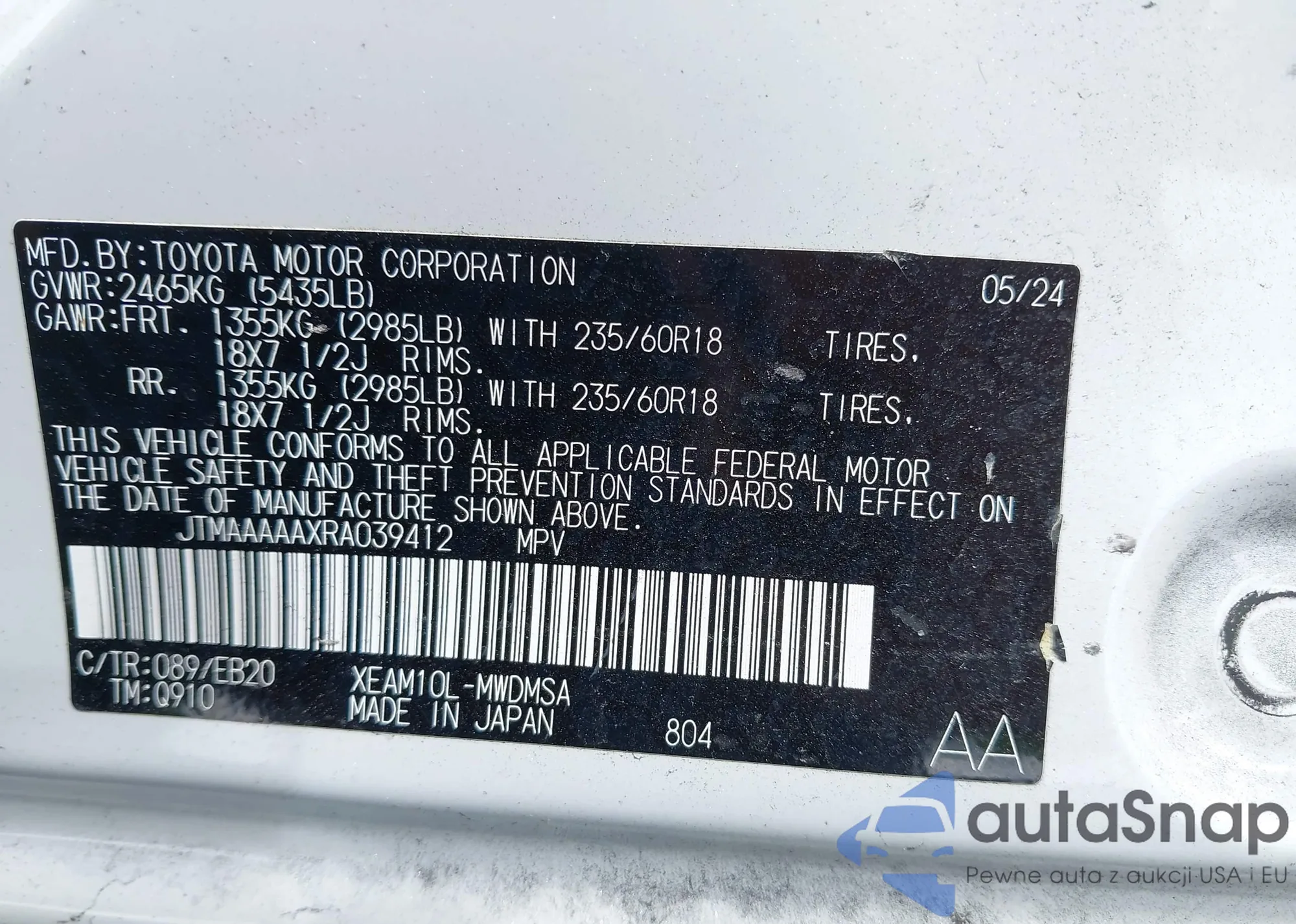 VIN: JTMAAAAAXRA039412