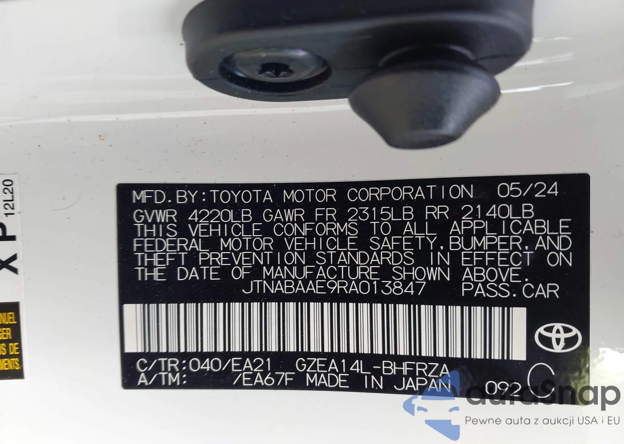 The car Toyota Corolla 2024 (VIN JTNABAAE9RA013847) has not been auctioned before. The documents are clean, and the mileage matches or is below the market average. Sold by an insurance company – we recommend purchase. Delivery to the port will take approx. 6–8 weeks.