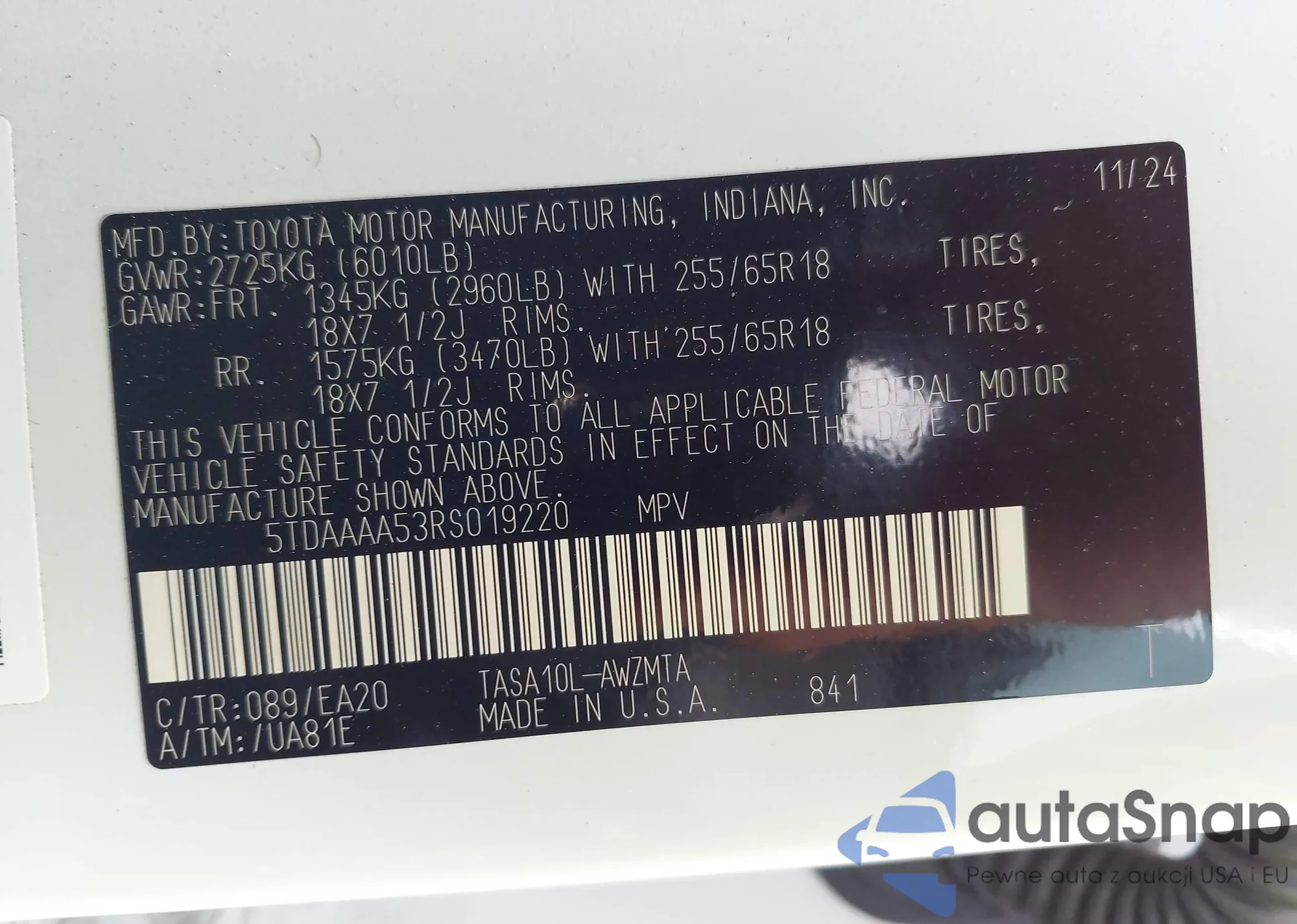 The car Toyota Highlander 2024 (VIN 5TDAAAA53RS019220) has not been auctioned before. The documents are clean, and the mileage matches or is below the market average. Sold by an insurance company – we recommend purchase. Delivery to the port will take approx. 6–8 weeks.