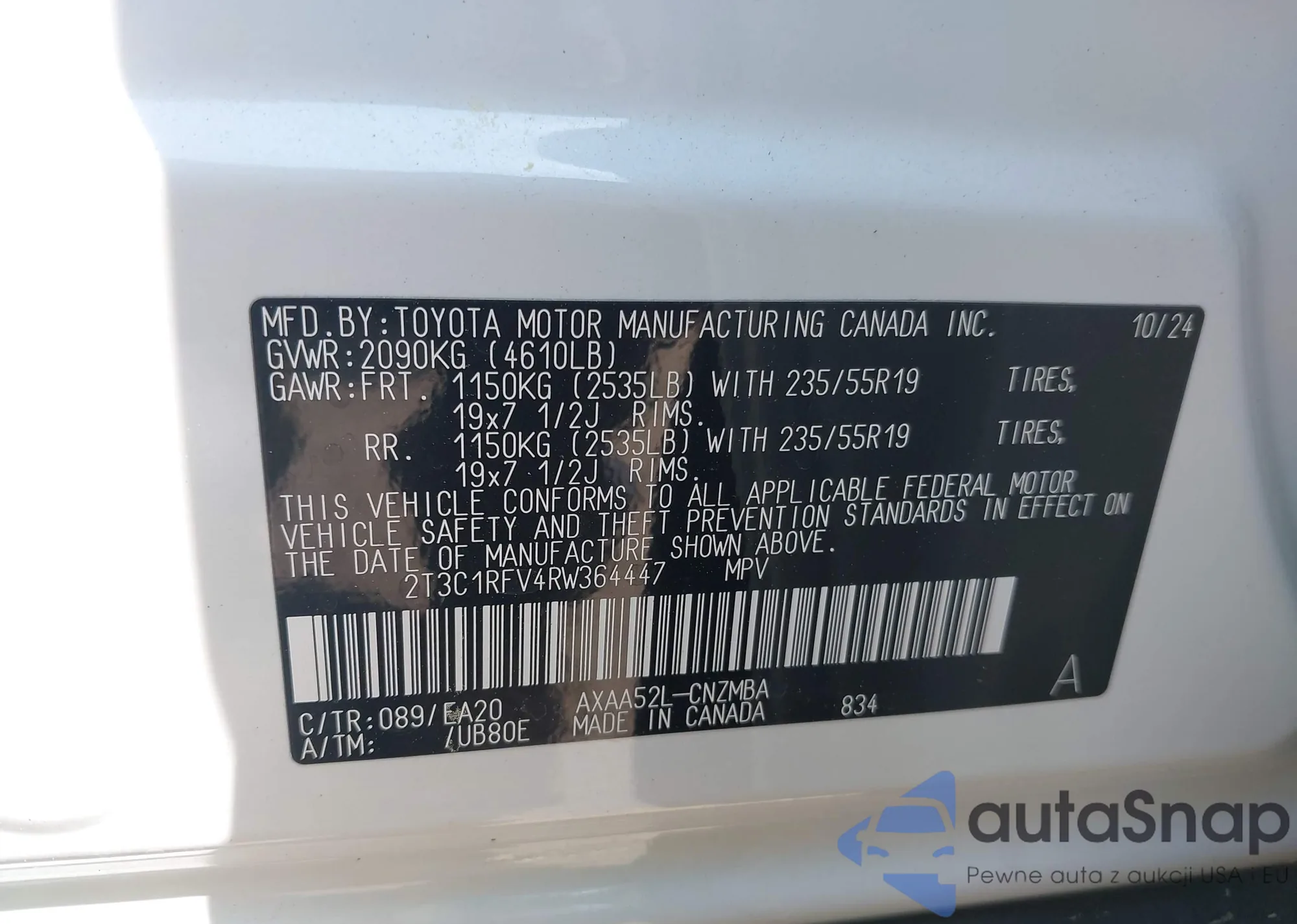 The car Toyota RAV 4 2024 (VIN 2T3C1RFV4RW364447) has not been auctioned before. The documents are clean, and the mileage matches or is below the market average. Sold by an insurance company – we recommend purchase. Delivery to the port will take approx. 6–8 weeks.
