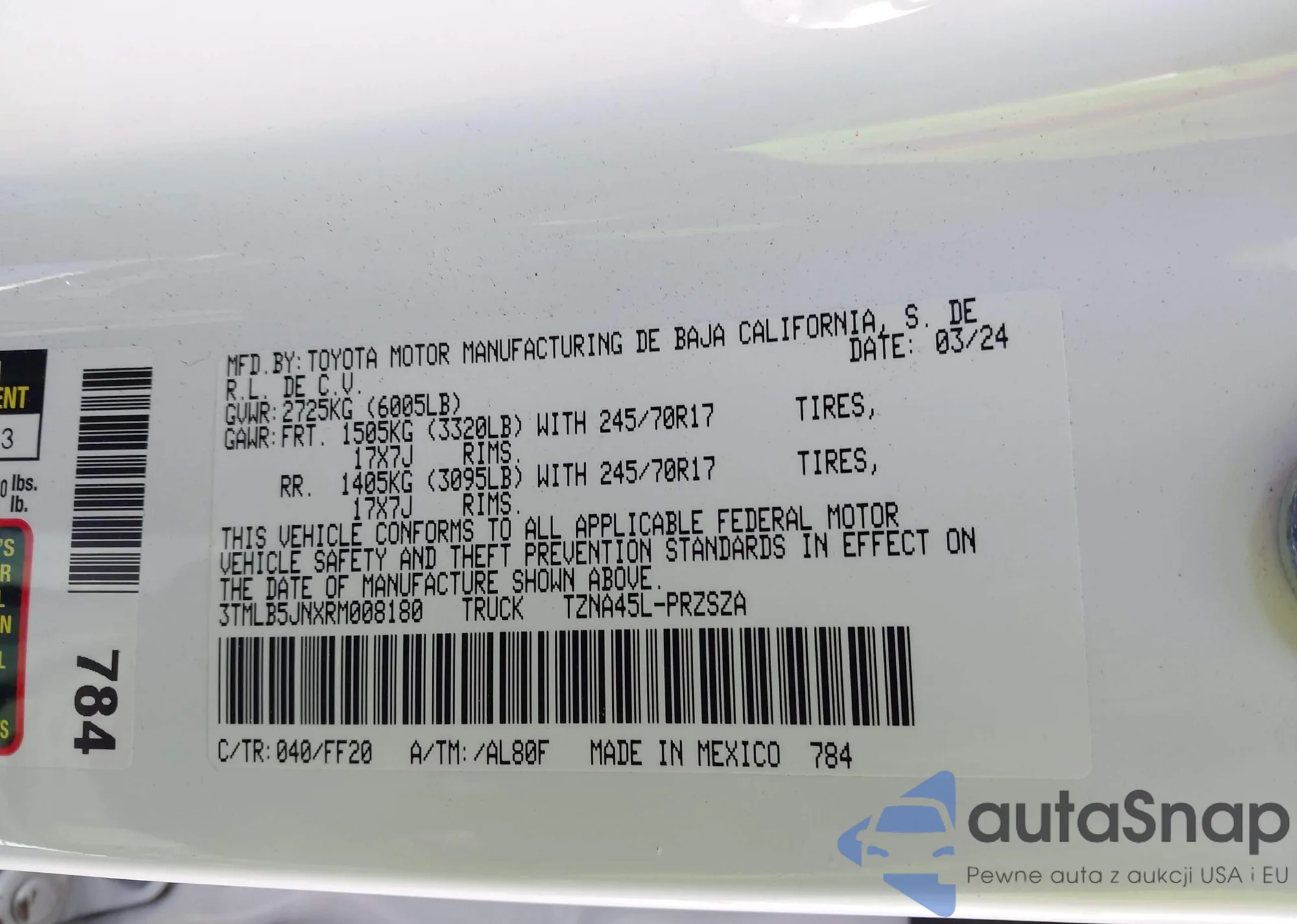 The car Toyota Tacoma 2024 (VIN 3TMLB5JNXRM008180) has not been auctioned before. The documents are clean, and the mileage matches or is below the market average. Sold by an insurance company – we recommend purchase. Delivery to the port will take approx. 6–8 weeks.