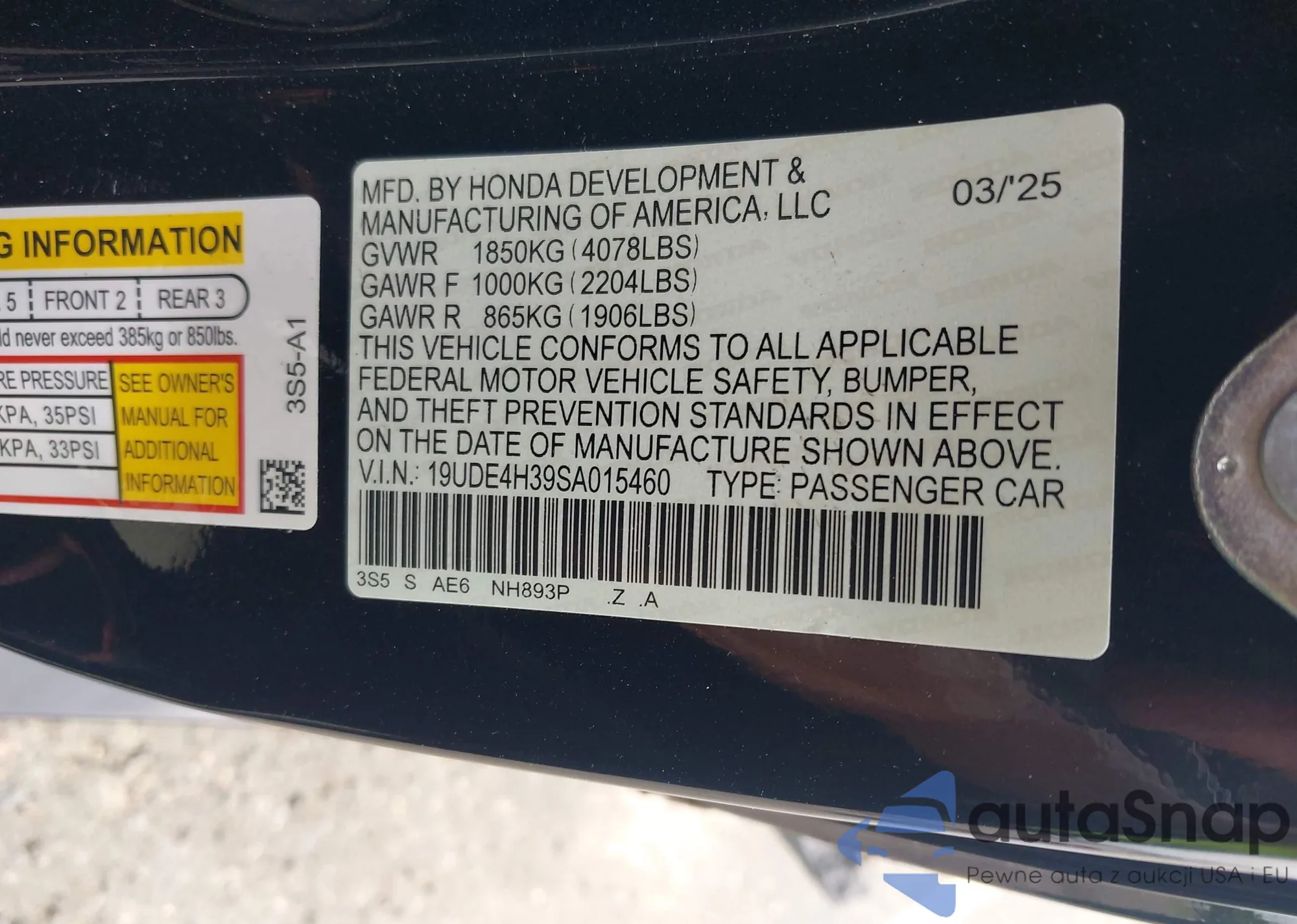 VIN: 19UDE4H39SA015460