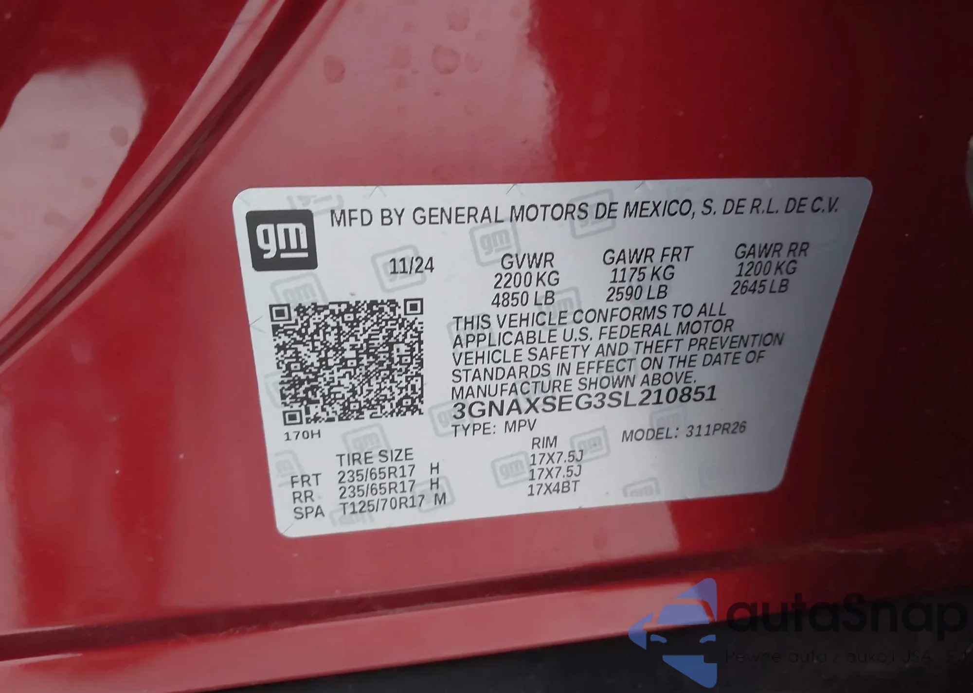 The car Chevrolet Equinox 2025 (VIN 3GNAXSEG3SL210851) has not been auctioned before. The documents are clean, and the mileage matches or is below the market average. Sold by an insurance company – we recommend purchase. Delivery to the port will take approx. 6–8 weeks.