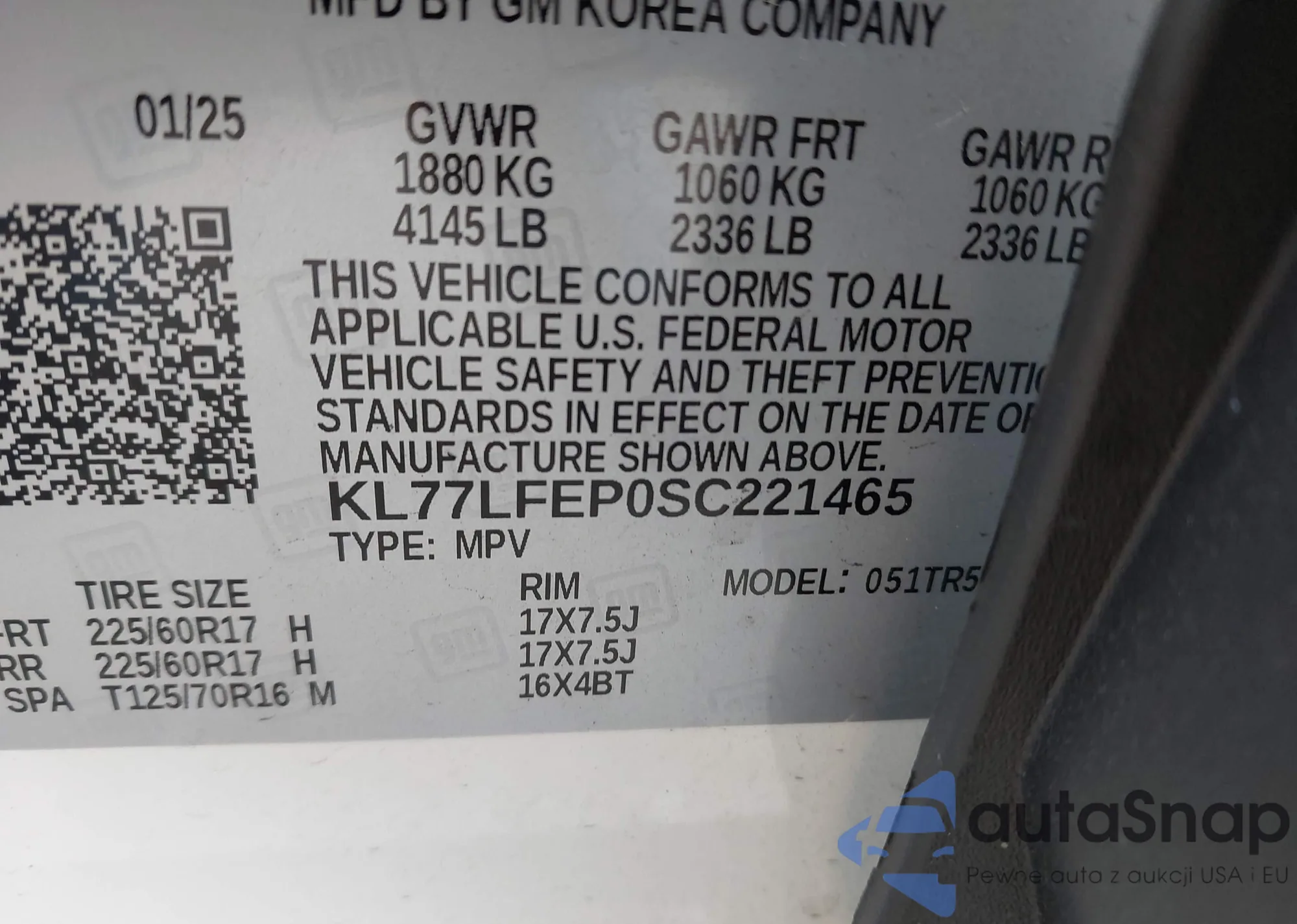 The car Chevrolet Trax 2025 (VIN KL77LFEP0SC221465) has not been auctioned before. The documents are clean, and the mileage matches or is below the market average. Sold by an insurance company – we recommend purchase. Delivery to the port will take approx. 6–8 weeks.