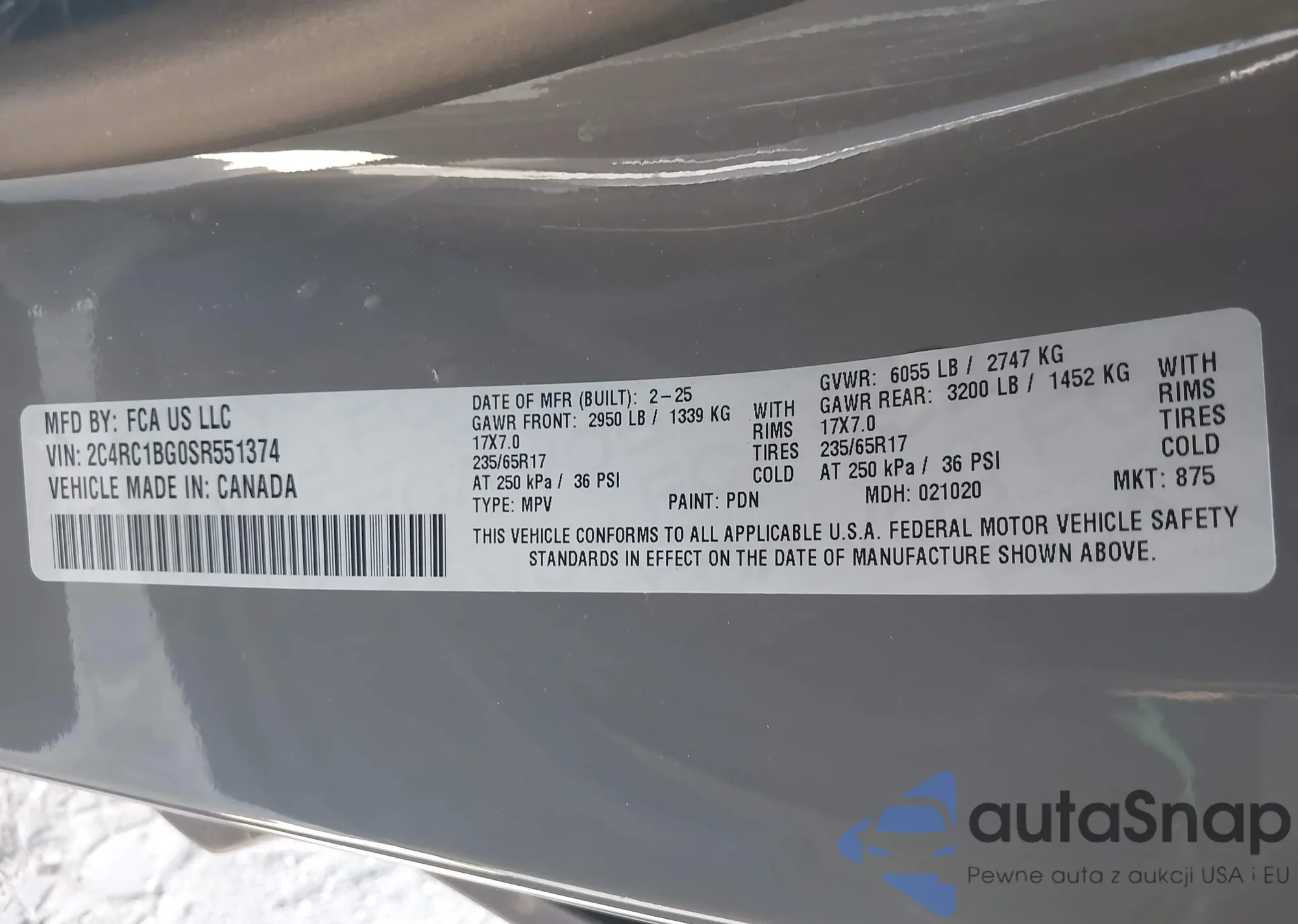 The car Chrysler Pacifica 2025 (VIN 2C4RC1BG0SR551374) is sold by an unverified seller. We recommend checking the Carfax report and confirming registration possibilities before purchase.