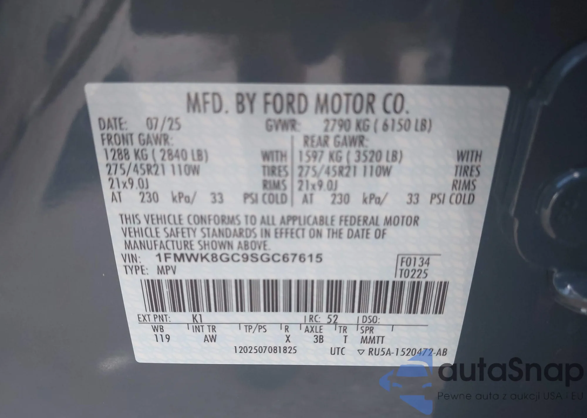 • VIN: 1FMWK8GC9SGC67615