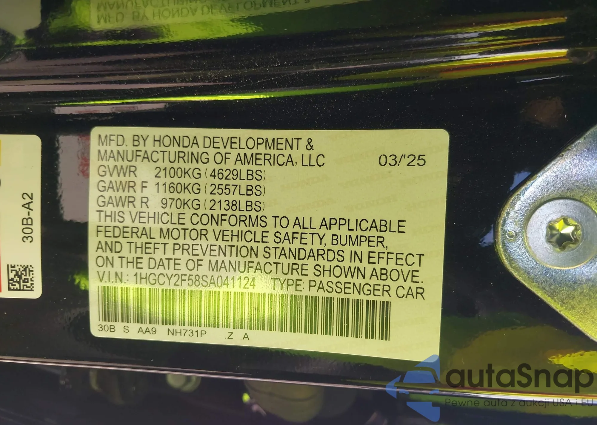 The car Honda Accord 2025 (VIN 1HGCY2F58SA041124) has not been auctioned before. The documents are clean, and the mileage matches or is below the market average. Sold by an insurance company – we recommend purchase. Delivery to the port will take approx. 6–8 weeks.