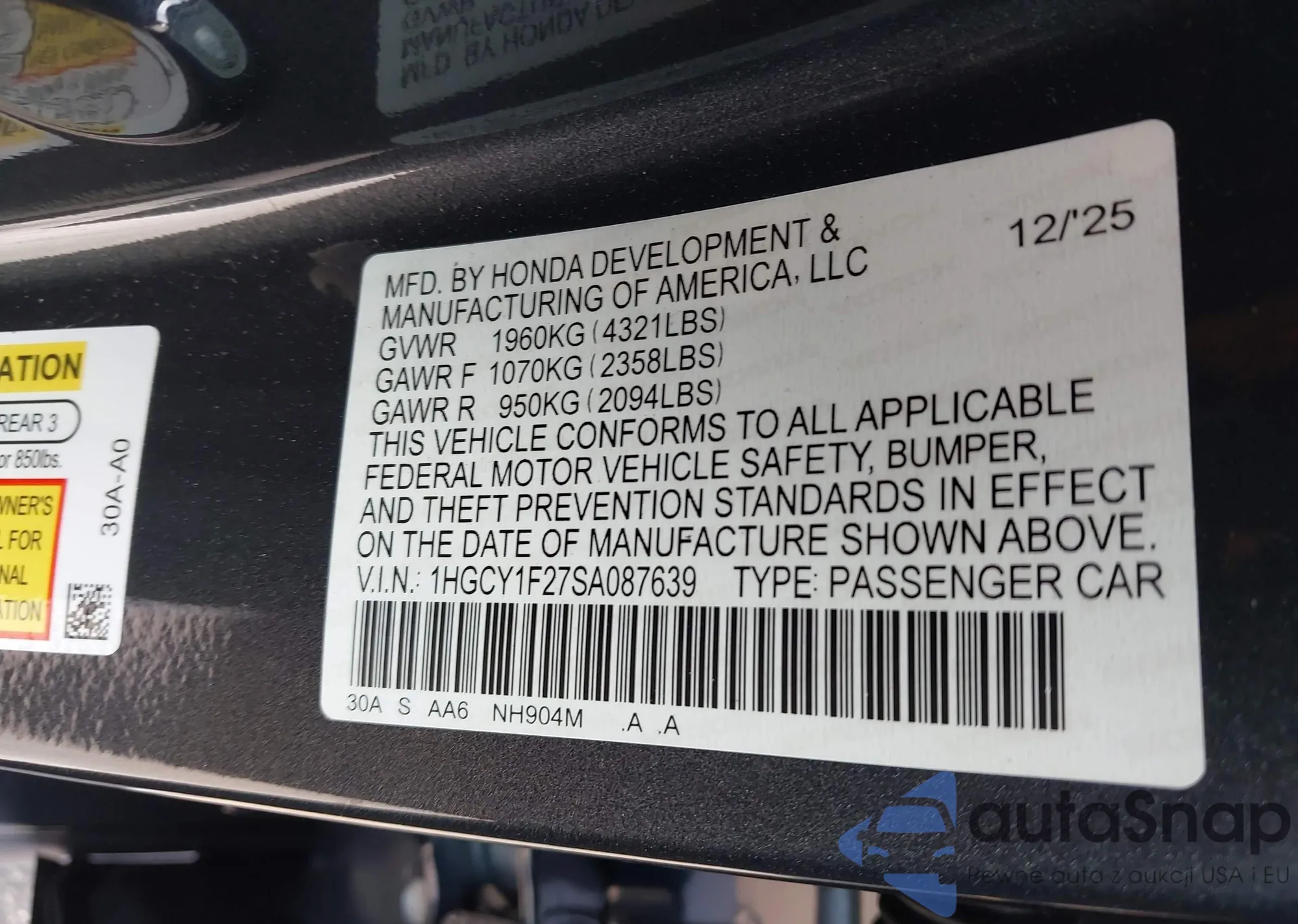 The car Honda Accord 2025 (VIN 1HGCY1F27SA087639) has not been auctioned before. The documents are clean, and the mileage matches or is below the market average. Sold by an insurance company – we recommend purchase. Delivery to the port will take approx. 6–8 weeks.