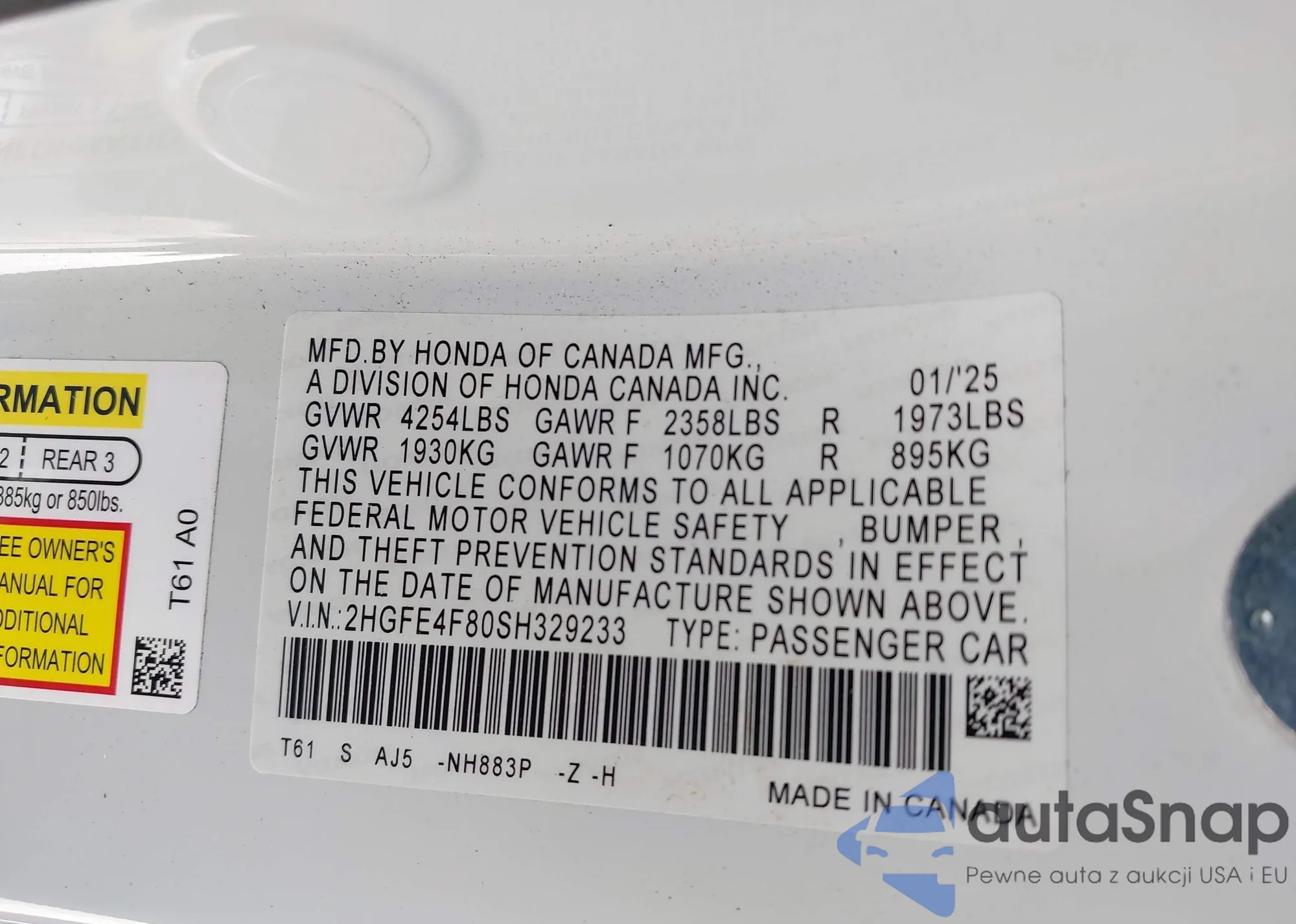 The car Honda Civic 2025 (VIN 2HGFE4F80SH329233) has not been auctioned before. The documents are clean, and the mileage matches or is below the market average. Sold by an insurance company – we recommend purchase. Delivery to the port will take approx. 6–8 weeks.