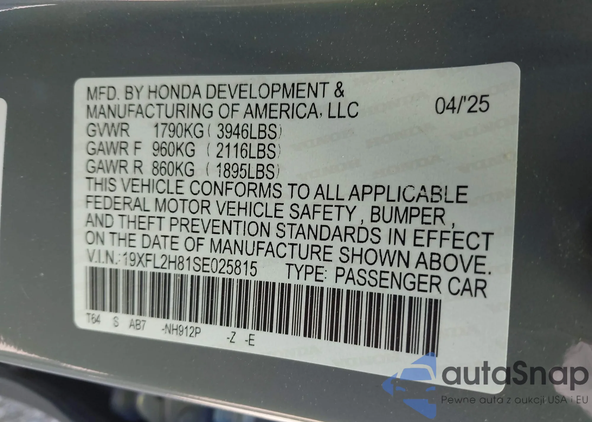 VIN: 19XFL2H81SE025815