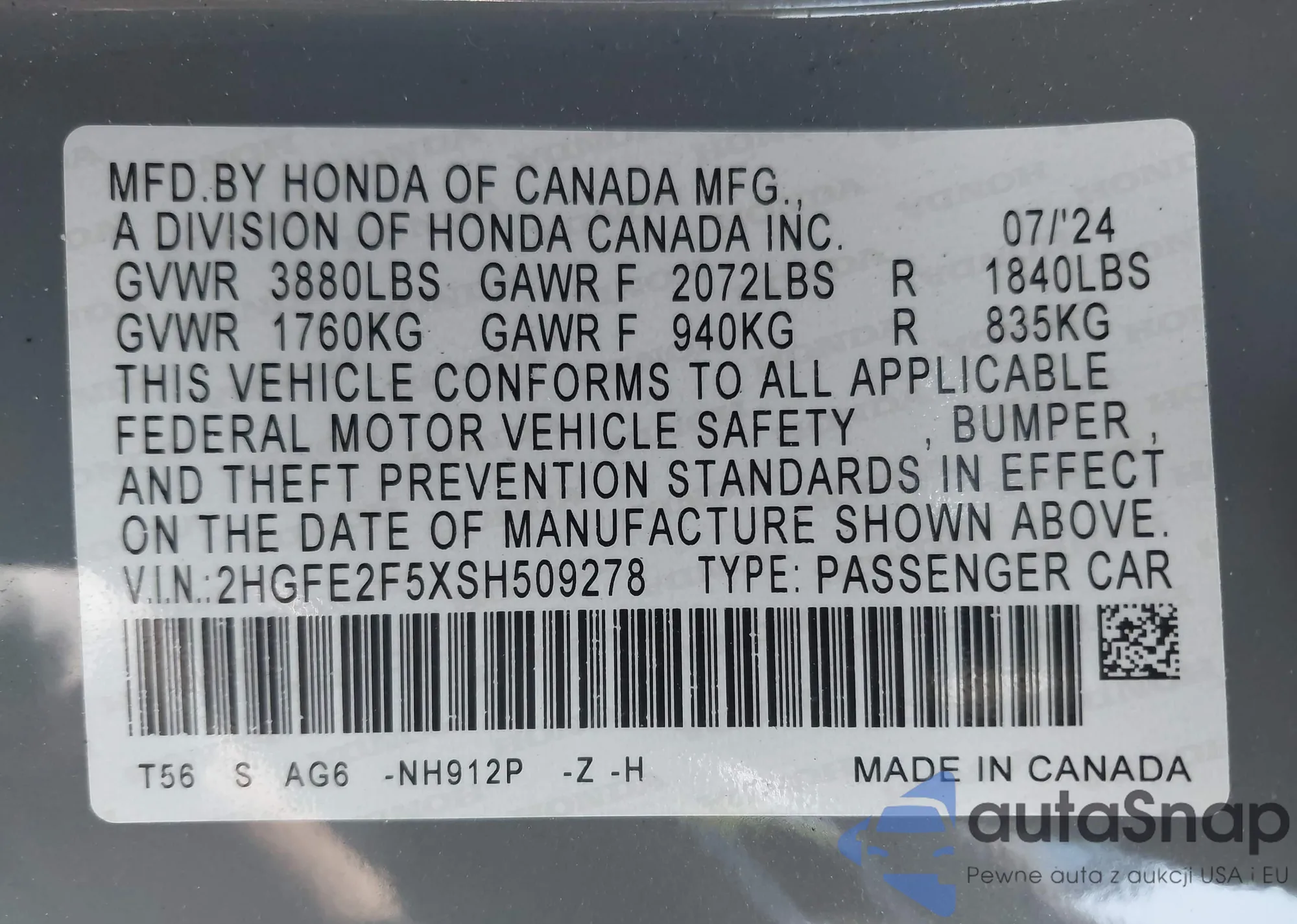 VIN: 2HGFE2F5XSH509278
