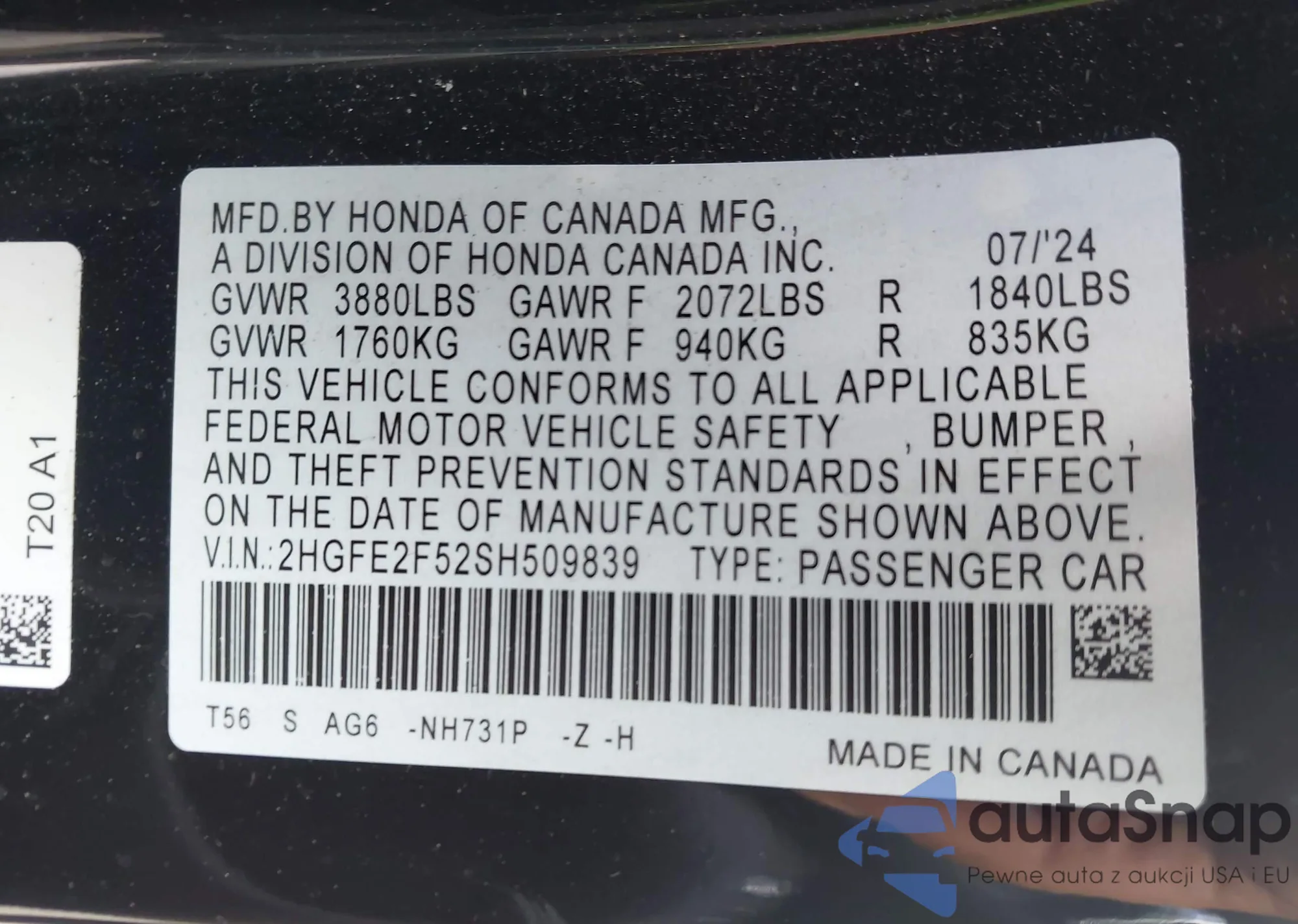 VIN: 2HGFE2F52SH509839