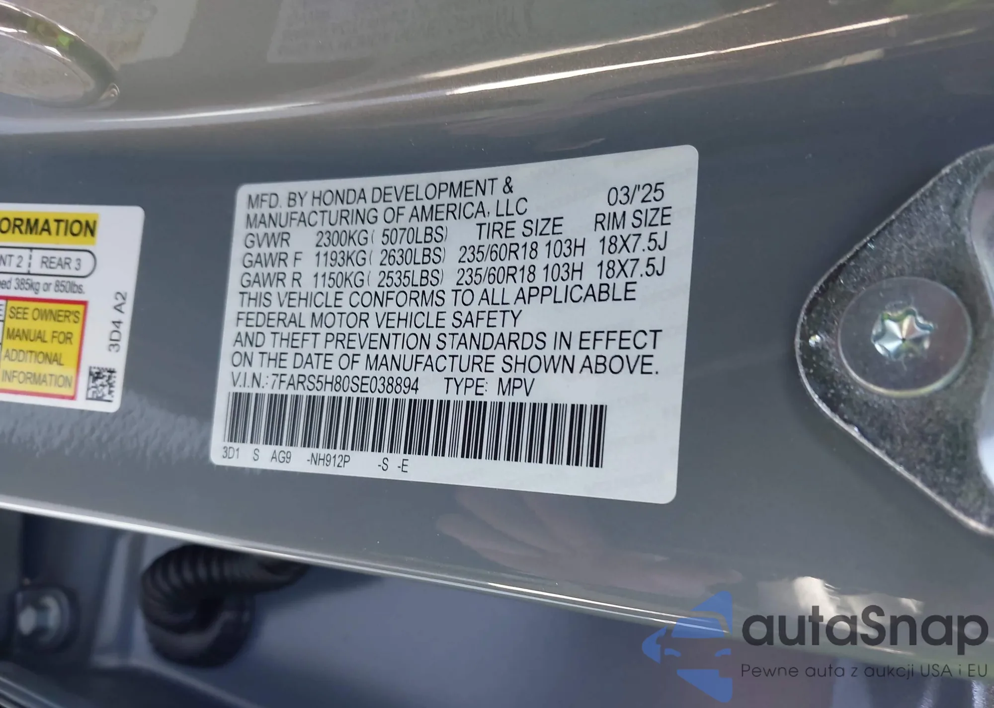The car Honda CR-V 2025 (VIN 7FARS5H80SE038894) has not been auctioned before. The documents are clean, and the mileage matches or is below the market average. Sold by an insurance company – we recommend purchase. Delivery to the port will take approx. 6–8 weeks.